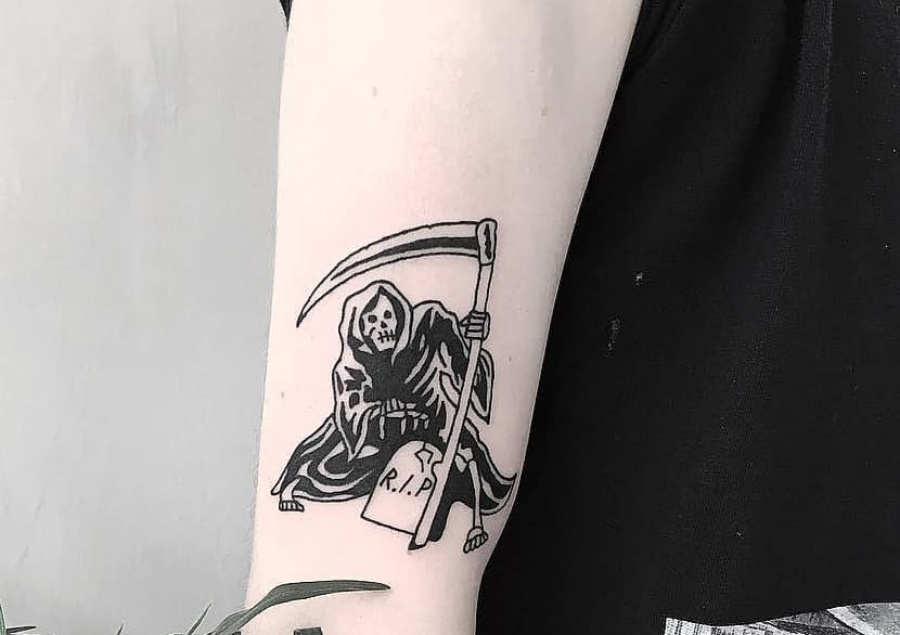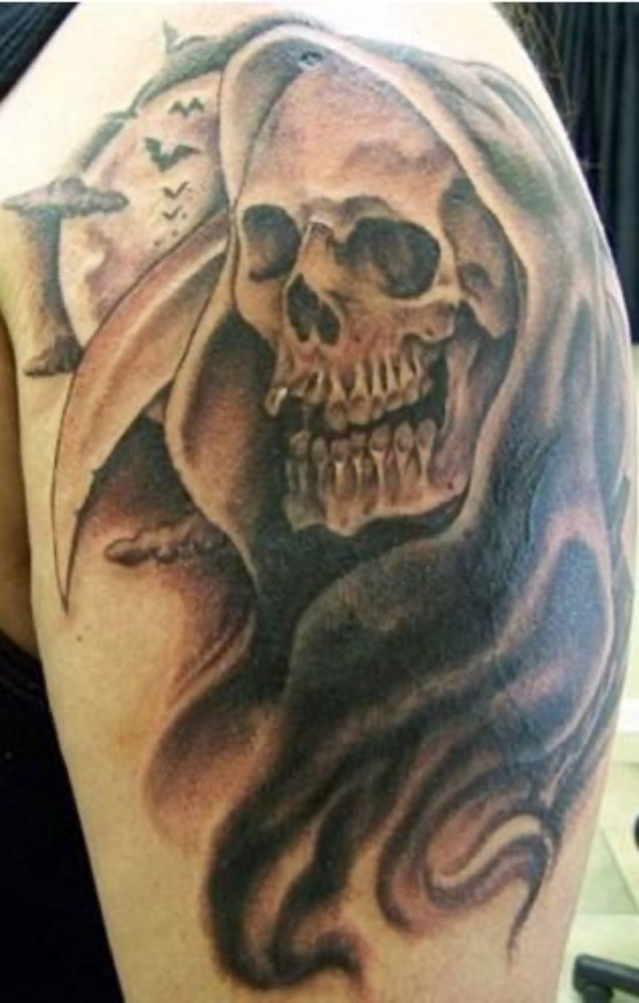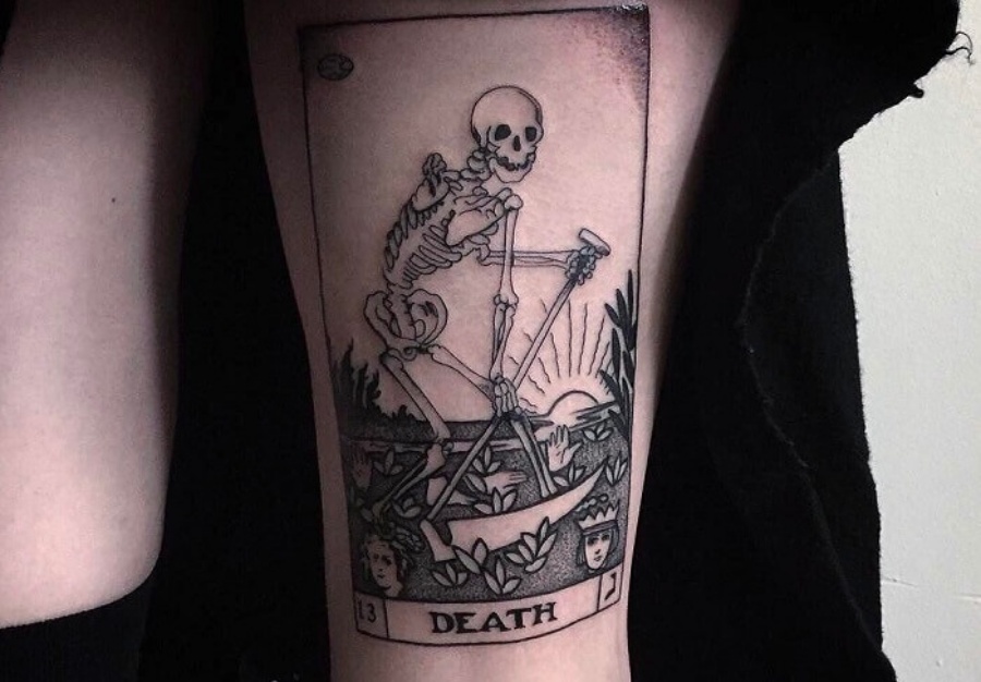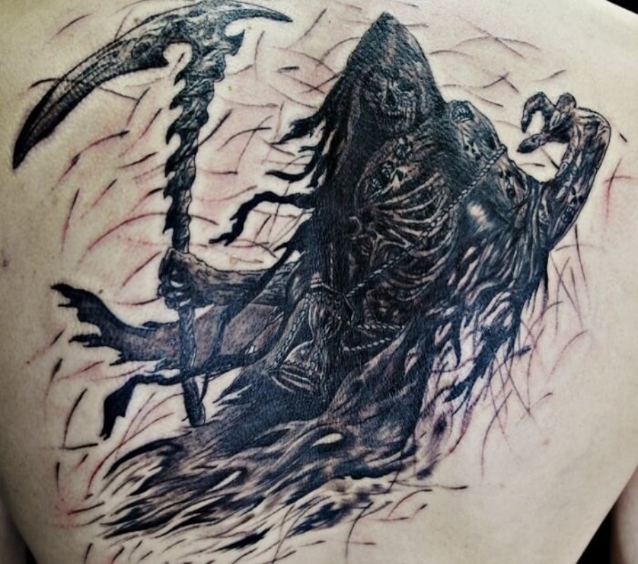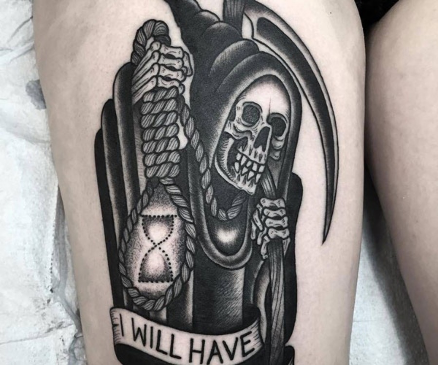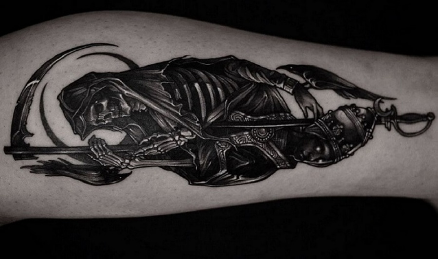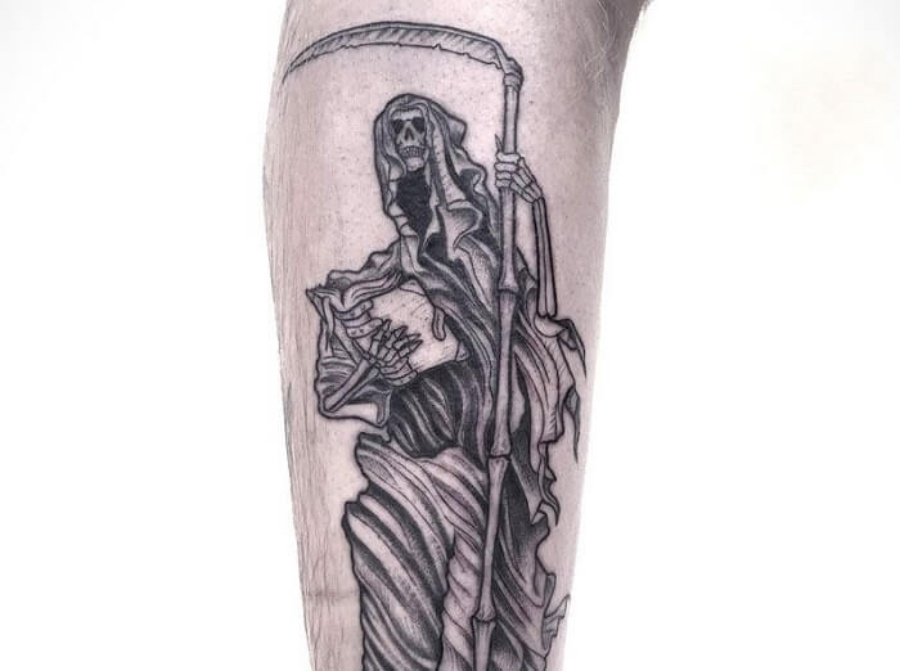 Mẫu hình xăm này thường đặc trưng với hình ảnh một chiếc đầu lâu được phủ chiếc áo đen kín đầu của thần chết và lưỡi hái tử thần trên tay. Hình ảnh này sẽ đem đến cảm giác có phần rợn người và vô cùng cá tính. Tuy nhiên, trên thực tế thì hình xăm này lại mang ý nghĩa ám chỉ bản thân bạn không hề sợ hãi trước cái chết và luôn cố gắng sống thật tốt để không bao giờ hối hận.