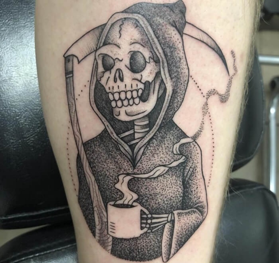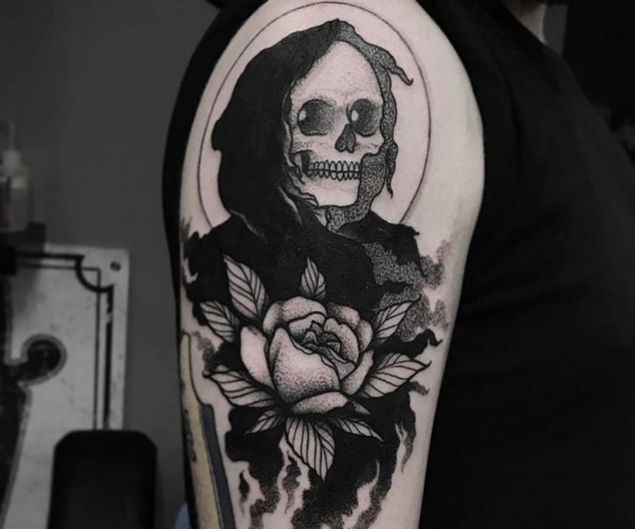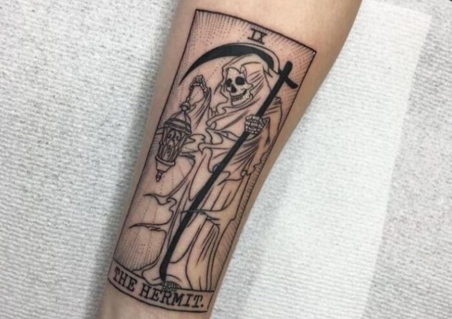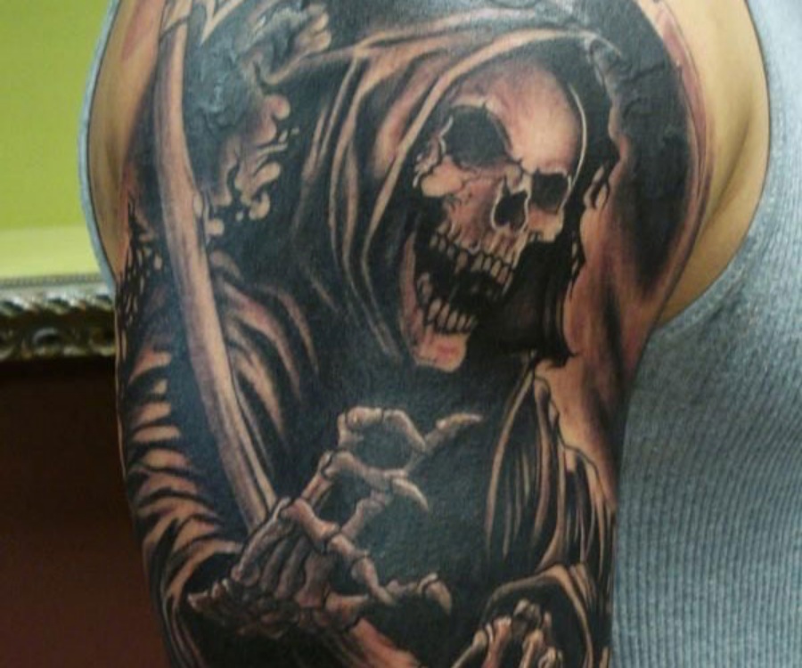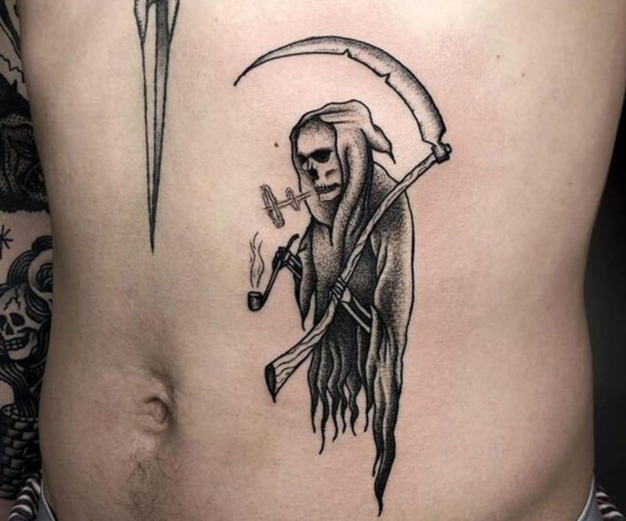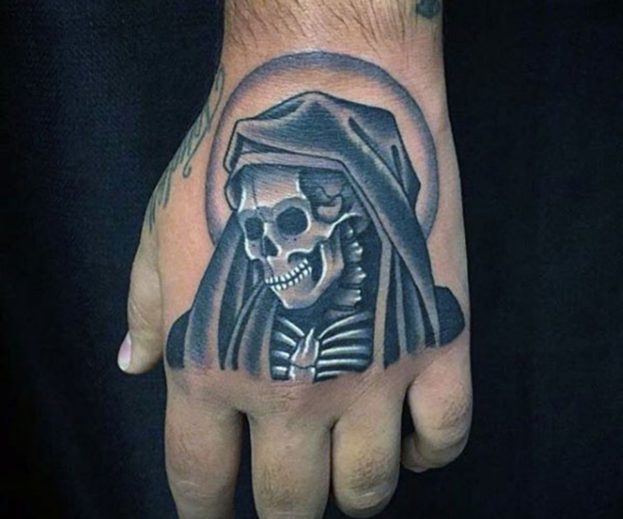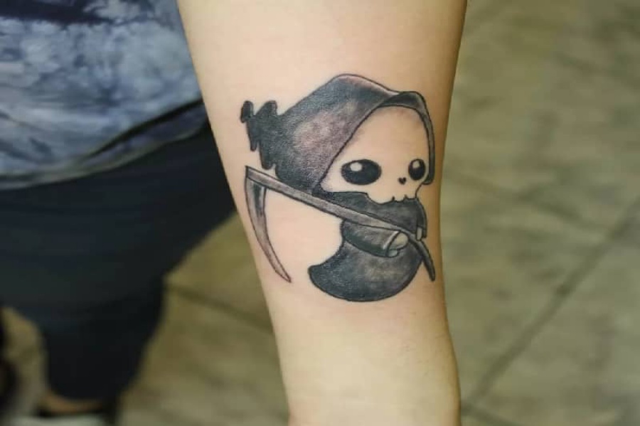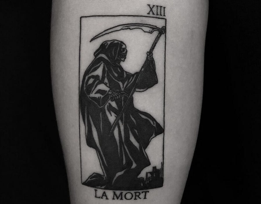 Mẫu hình xăm này thường đặc trưng với hình ảnh một chiếc đầu lâu được phủ chiếc áo đen kín đầu của thần chết và lưỡi hái tử thần trên tay. Hình ảnh này sẽ đem đến cảm giác có phần rợn người và vô cùng cá tính. Tuy nhiên, trên thực tế thì hình xăm này lại mang ý nghĩa ám chỉ bản thân bạn không hề sợ hãi trước cái chết và luôn cố gắng sống thật tốt để không bao giờ hối hận.