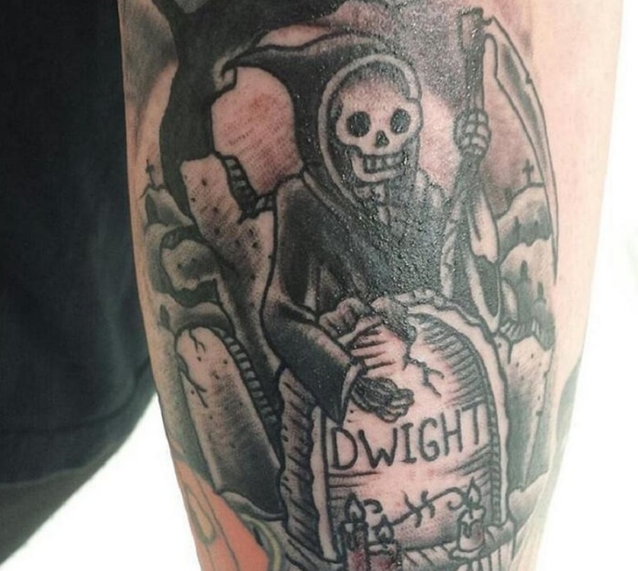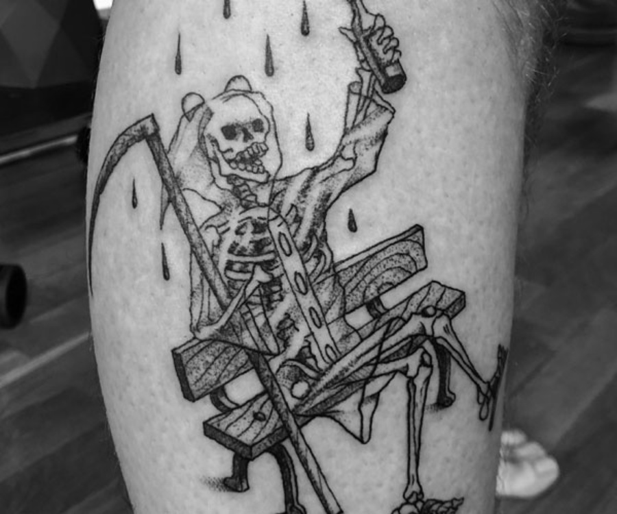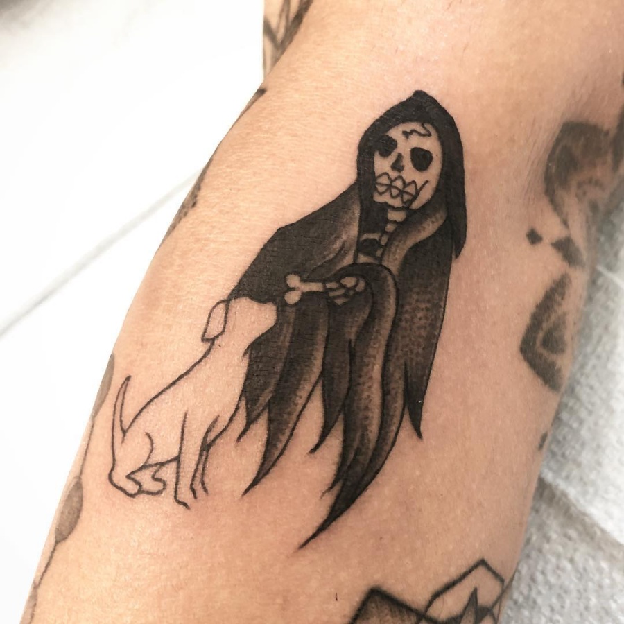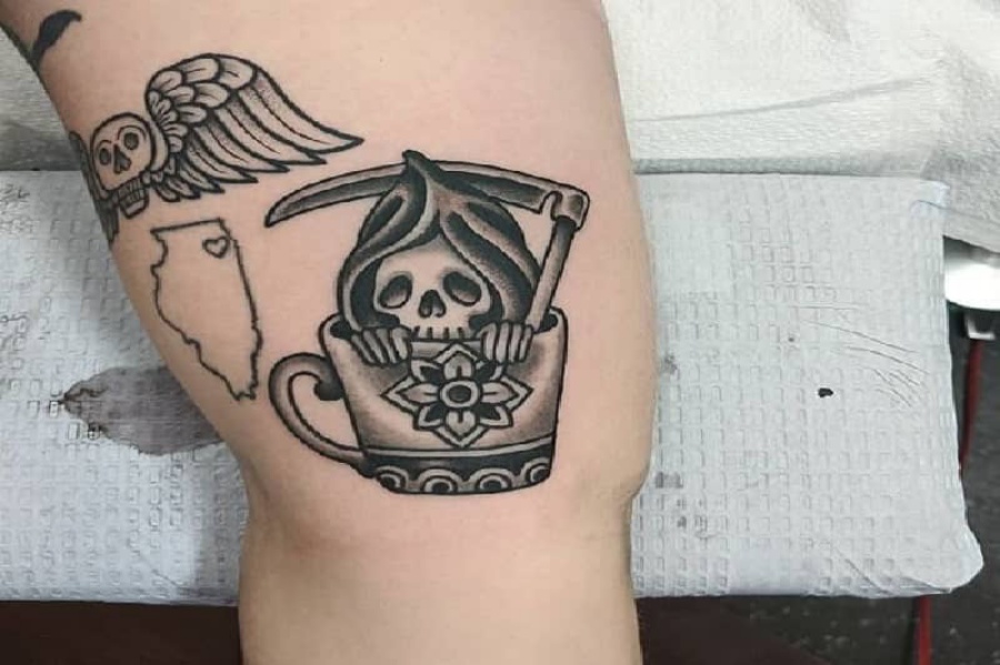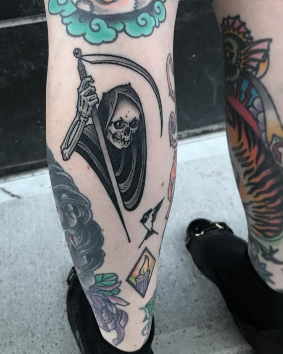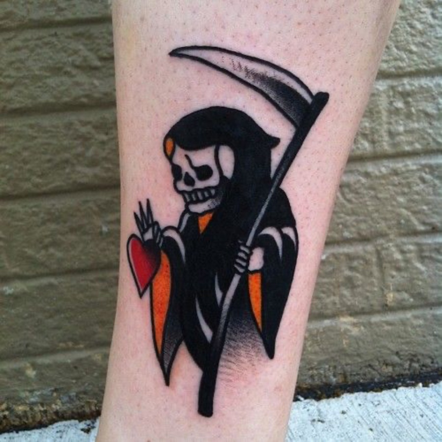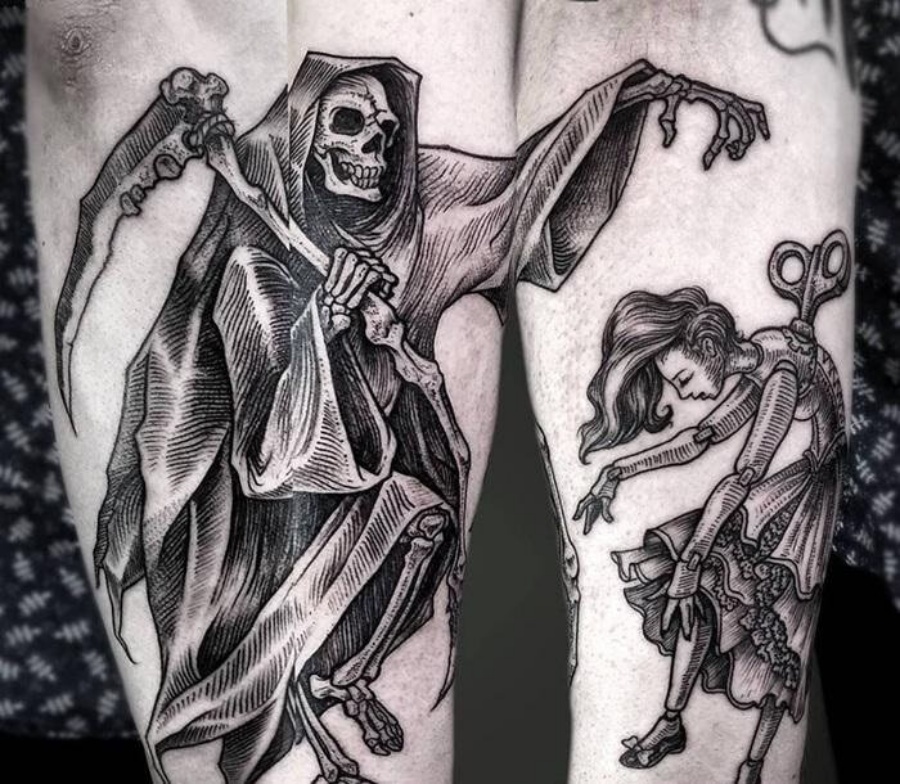 Mẫu hình xăm này thường đặc trưng với hình ảnh một chiếc đầu lâu được phủ chiếc áo đen kín đầu của thần chết và lưỡi hái tử thần trên tay. Hình ảnh này sẽ đem đến cảm giác có phần rợn người và vô cùng cá tính. Tuy nhiên, trên thực tế thì hình xăm này lại mang ý nghĩa ám chỉ bản thân bạn không hề sợ hãi trước cái chết và luôn cố gắng sống thật tốt để không bao giờ hối hận.