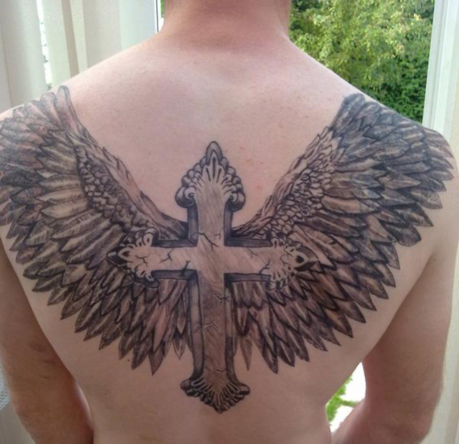 Hình xăm thánh giá có cánh ở lưng ẩn chứa hàm ý bảo vệ, che chở và tin vào cái thiện. Những chủ nhân sở hữu hình xăm này thường rất bình tĩnh, biết cách xử lý vấn đề, nhận thức được giữa cái thiện và cái ác, thường không có âm mưu hại người.