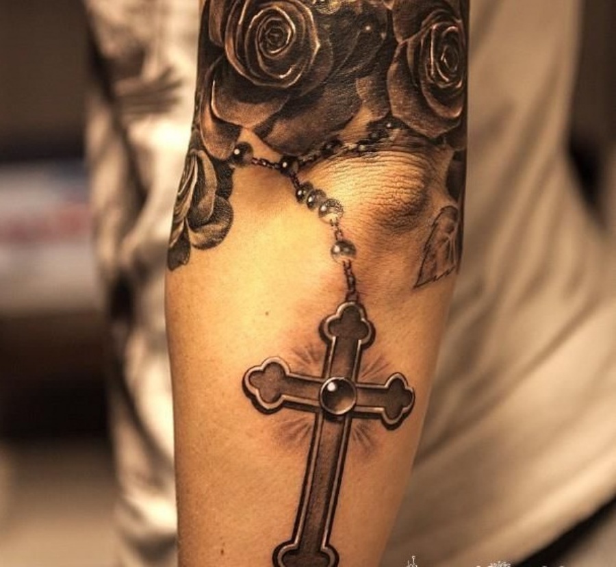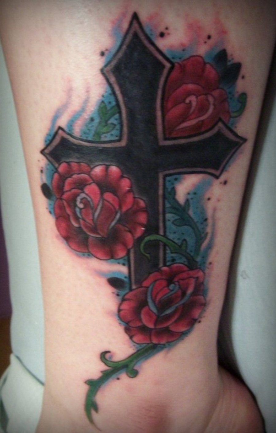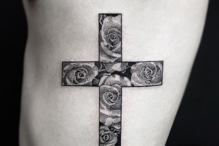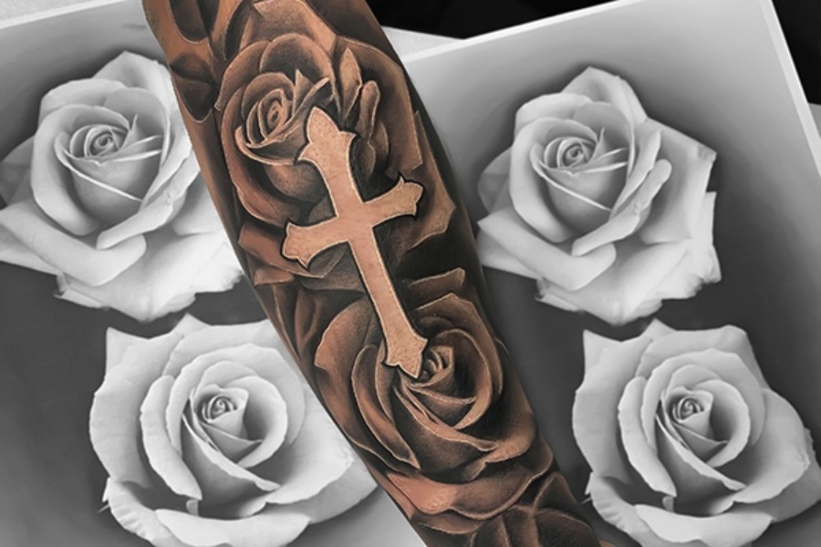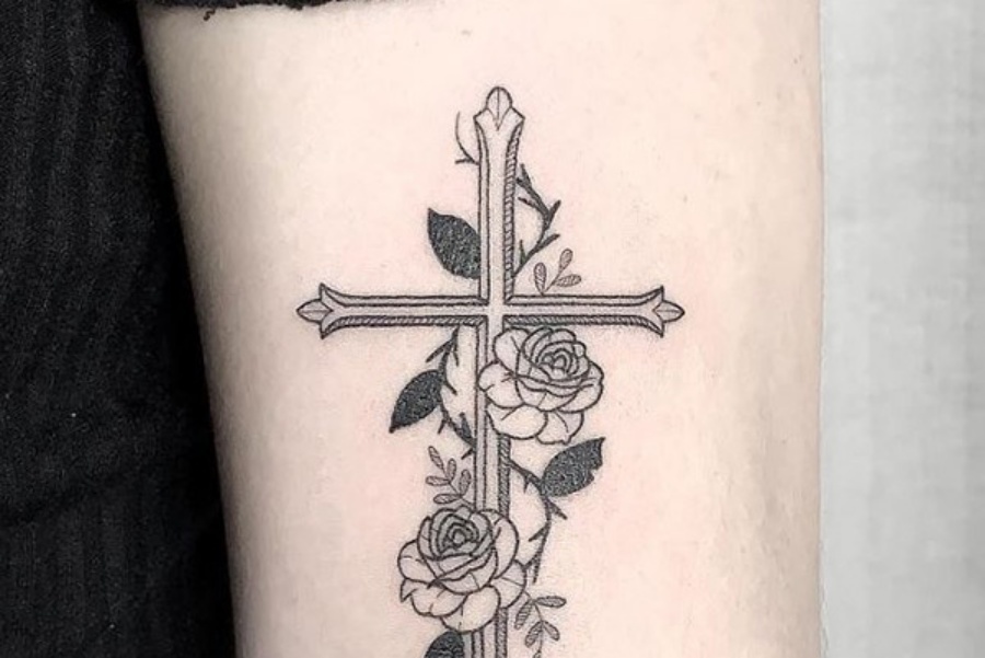 Đây là mẫu hình xăm có sự kết hợp hài hòa giữa là thánh giá và hoa hồng. Bạn có thể chọn hình xăm theo hướng hoa hồng trộn lẫn hoặc quấn quanh thánh giá.