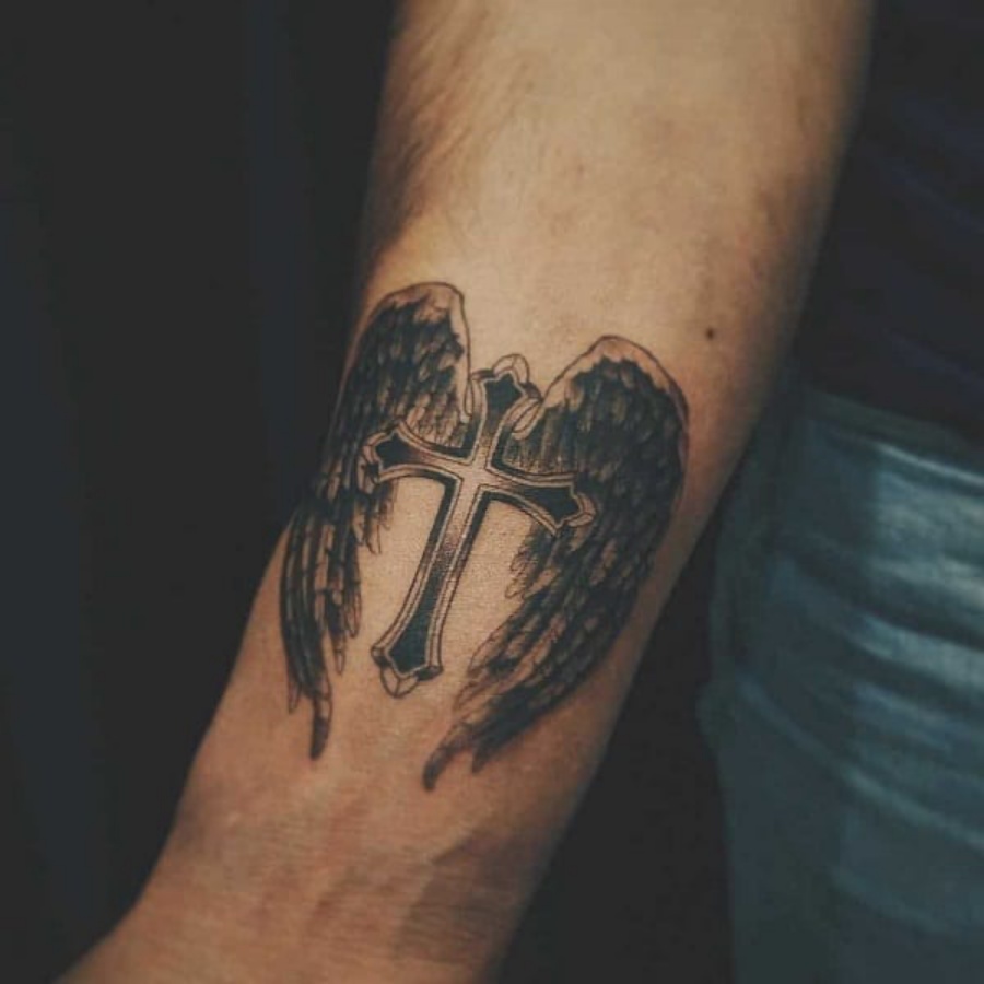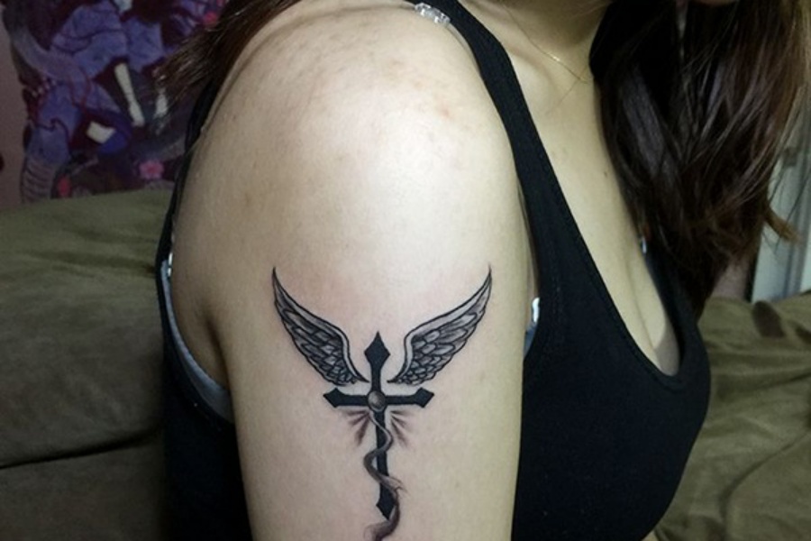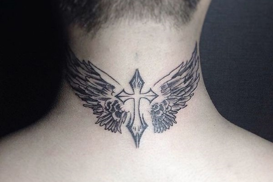 Mẫu hình đầu tiên bạn nên chọn đó là “thập giá có cánh” ở lưng. Hình xăm tái hiện bộ đôi cánh thiên thần ở 2 bên thánh giá mang theo bản tính lương thiện, hướng đến hình ảnh Chúa linh thiêng.