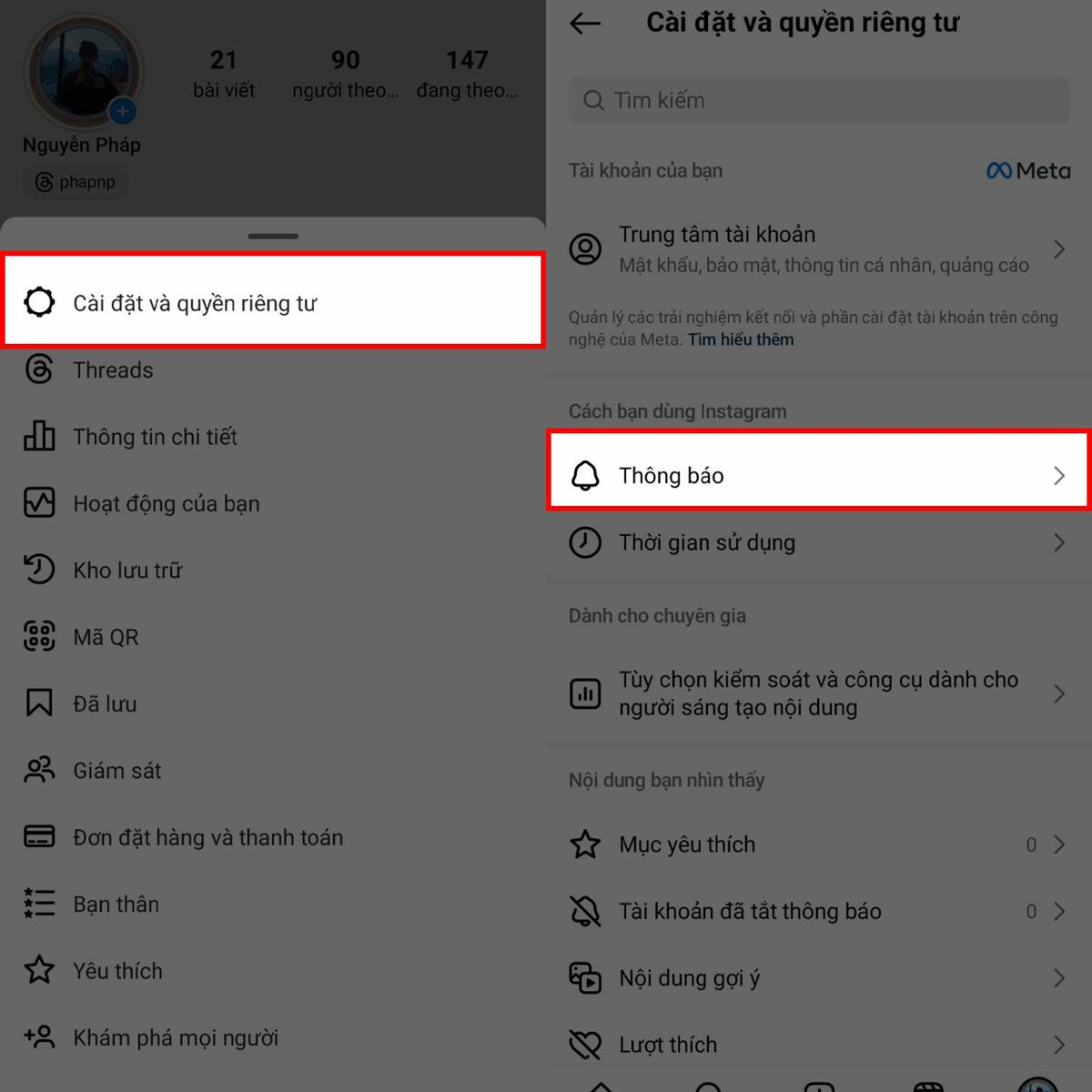 Bước 2: Tại giao diện bước này, có 1 loạt các tùy chọn thêm sẽ hiện lên từ phía bên dưới màn hình. Trong đó, có 1 mục là Cài đặt & quyền riêng tư, hãy ấn vào đó > Tiếp theo hãy chọn vào mục Thông báo.