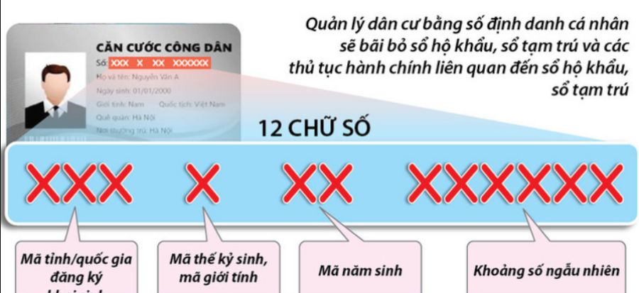 - Mã số định danh cá nhân là dãy số tự nhiên gồm 12 số, có cấu trúc gồm 6 số là mã thế kỷ sinh, mã giới tính, mã năm sinh của công dân, mã tỉnh, thành phố trực thuộc trung ương hoặc mã quốc gia nơi công dân đăng ký khai sinh và 6 số là khoảng số ngẫu nhiên.