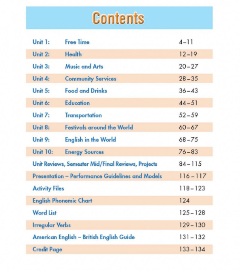 Sách bao gồm 10 đơn vị học bài với 10 chủ đề gắn với cuộc sống sinh hoạt hằng ngày: Free Time, Health, Music and Arts, community Serivices, Food and Drinks, Education, Transportation, Festivals around the world, English in the World, Energy Sources.