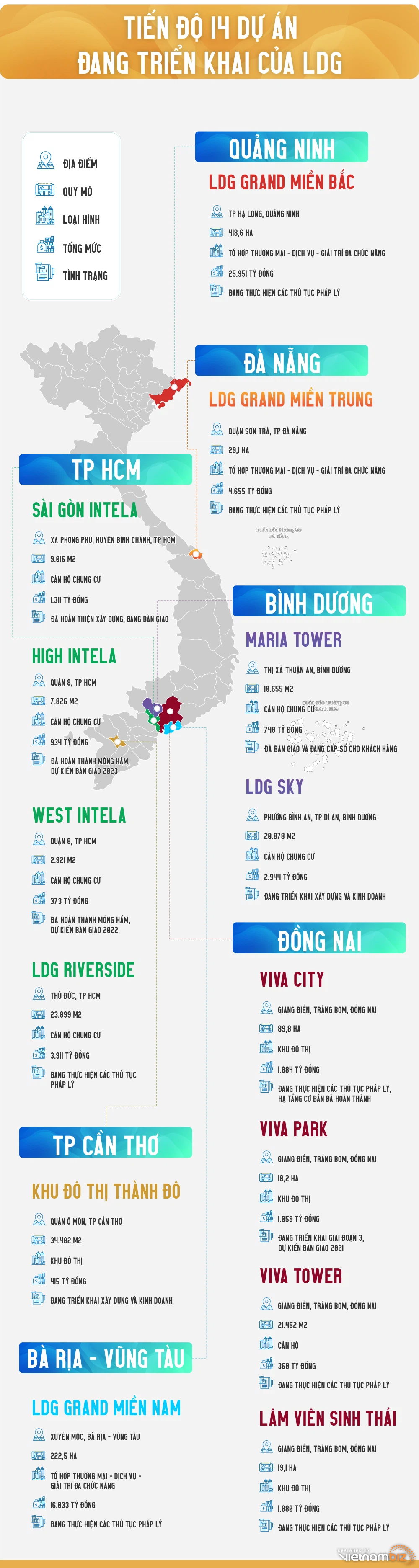 Đội ngũ Invert.vn gởi đến nhà đầu tư toàn cảnh tiến độ của 14 dự án của LDG Group đang triển khai. Tính đến thời điểm hiện tại, LDG Group đã sở hữu quỹ đất sạch lên đến 1000ha, trải dài trên cả nước ta, từ Quảng Ninh, Đà Nẵng đến TP HCM, Bình Dương, Đồng Nai Bà Rịa - Vũng Tàu,...