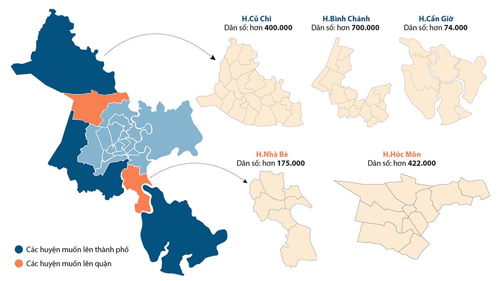 Theo Sở Nội vụ TP HCM, các huyện Hóc Môn, Bình Chánh, Nhà Bè, Củ Chi và Cần Giờ chủ yếu ở vị trí cửa ngõ thành phố, kết nối các tỉnh miền Đông và Tây Nam Bộ. Những năm qua, các địa phương này tốc độ đô thị hoá nhanh, nhiều khu đô thị, hạ tầng, tuyến cao tốc đã và đang hình thành. Trình độ dân trí, lối sống đô thị được hình thành và không khác biệt nhiều so với các quận nội thành.