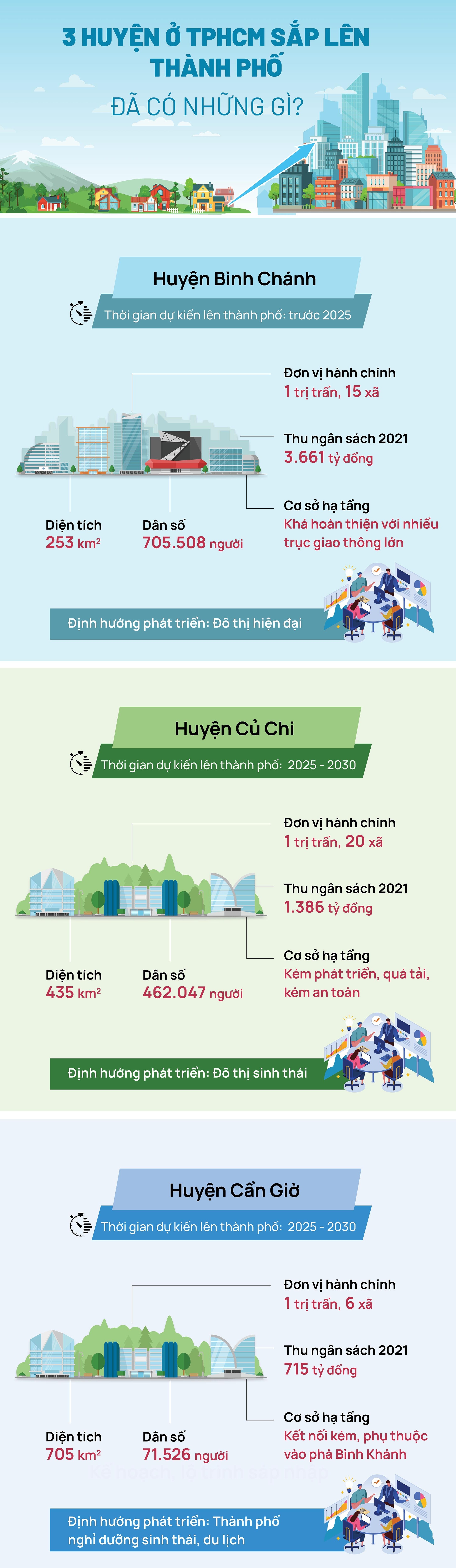 Ba huyện ngoại thành tại TPHCM lần lượt là huyện Bình Chánh, Củ Chi và Cần Giờ, trong lộ trình phát triển sắp tới của địa phương, sẽ không phải chuyển lên quận mà "lên thẳng" thành phố trực thuộc thành phố...