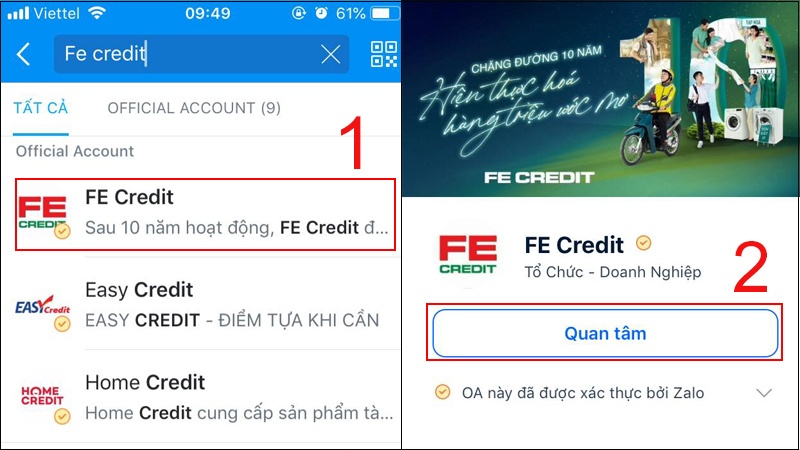 Sau đó, nhấn chọn trang Zalo OA của FE Credit -> Bấm Quan tâm.