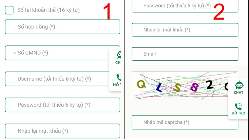 Bước 2: Kế đến, bạn tiến hành nhập thông tin Số hợp đồng, Số CMND, Username (tên tài khoản đăng nhập), Password (Mật khẩu đăng nhập), Email và Mã captcha.