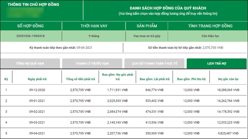 Bước 5: Tại đây, toàn bộ thông tin về hợp đồng vay của bạn sẽ được hiện ra bao gồm lịch sử thanh toán, số tiền cần thanh toán, lãi suất vay,… để bạn có thể tra cứu.