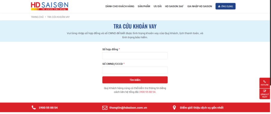 Bước 2: Kế đến, sau khi truy cập vào website của HD Saigon. Trên thanh Menu bạn lựa chọn mục “Tra cứu khoản vay” và tiến hành nhập thông tin theo yêu cầu của HD Saigon.