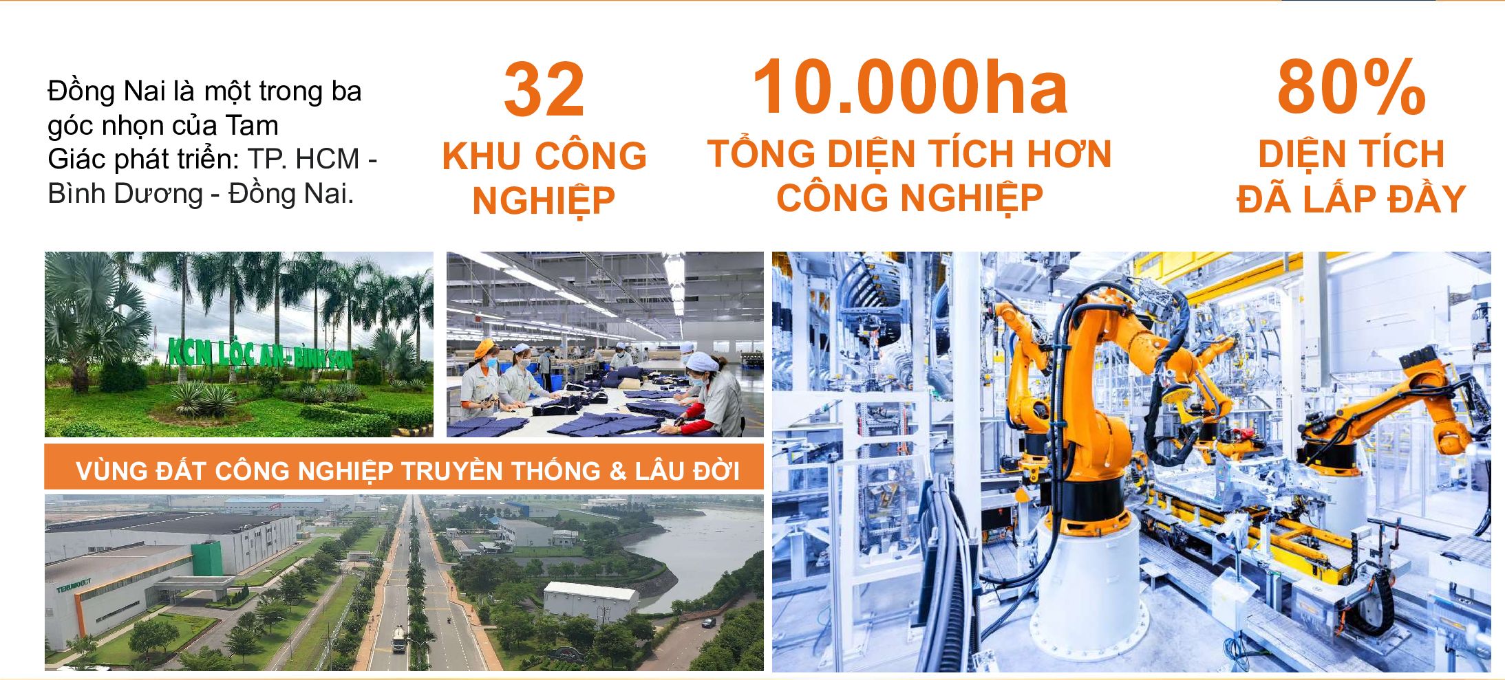 Đồng Nai là một trong ba góc nhọn của Tam Giác phát triển: TP. HCM - Bình Dương - Đồng Nai. Gồm 32 KHU CÔNG NGHIỆP, 10.000ha TỔNG DIỆN TÍCH HƠN CÔNG NGHIỆP, 80% DIỆN TÍCH ĐÃ LẤP ĐẦY