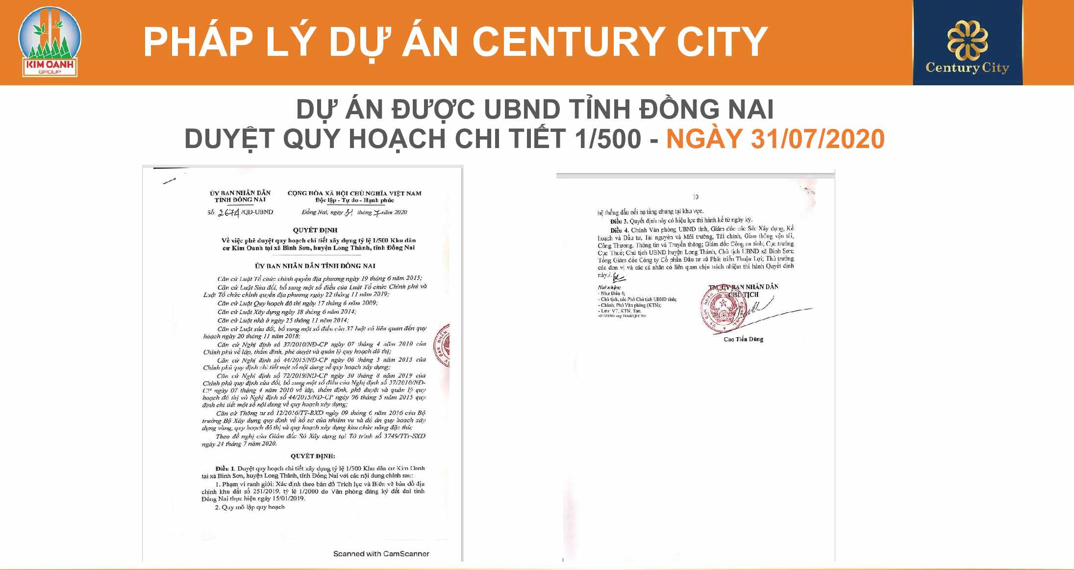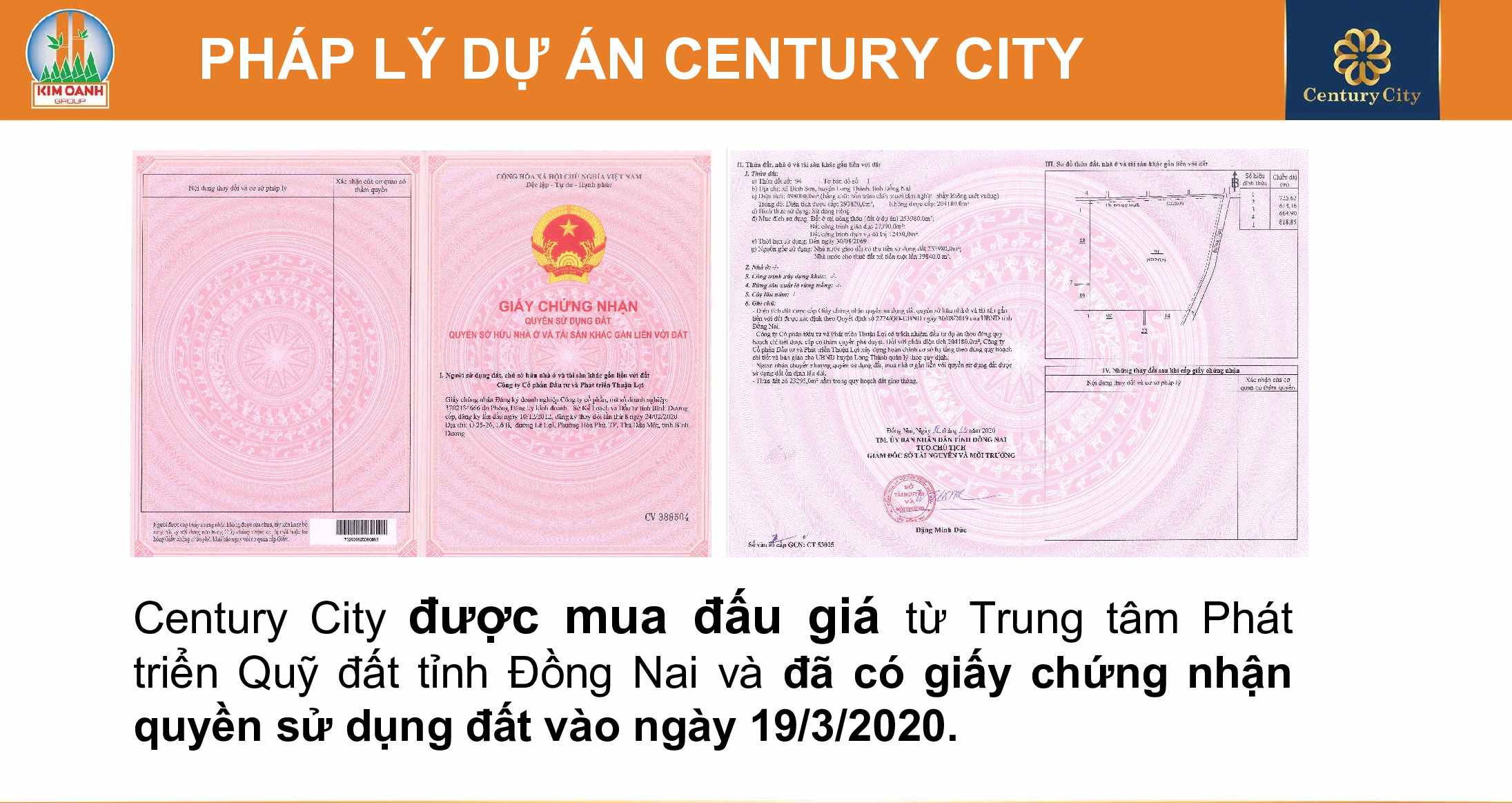 Pháp lý minh bạch của Century City đã Phê duyệt 1/500, đã có giấy chứng nhận QSDĐ. Về nguồn gốc quỹ đất dự án Century City được mua đấu giá từ Trung tâm Phát triển Quỹ đất tỉnh Đồng Nai và đã có giấy chứng nhận quyền sử dụng đất vào ngày 19/3/2020.