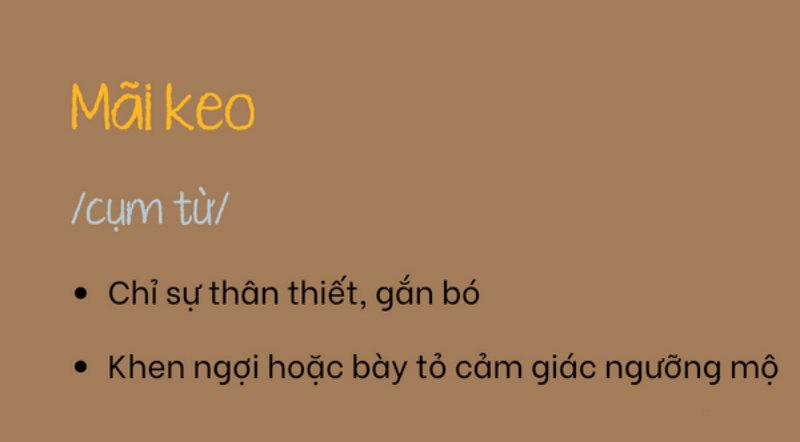 Mãi keo là một cụm từ ghép, kết hợp giữa từ “mãi” (trong mãi mãi) và “keo” (trong chất keo dính). Ngày nay, nhiều bạn trẻ gen Z thường sử dụng cụm từ này để ám chỉ mối quan hệ gắn kết, bền chặt đến mức không thể tách rời.