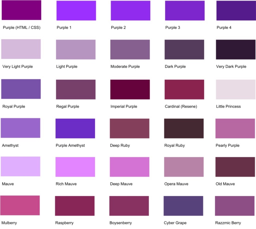 Chúng ta có thể phân biệt được rất nhiều màu tím khác nhau tùy theo độ pha trộn với tỷ lệ đậm nhạt. Những màu tím thường thấy trong cuộc sống hàng ngày đó là: