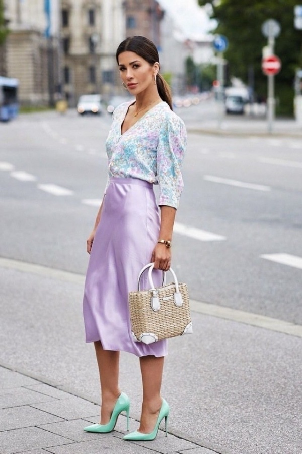 Cách phối đồ xanh ngọc với tím cũng là một cách phối đồ được rất nhiều chị em áp dụng. Thông thường, màu tím pastel được yêu thích nhiều hơn so với màu tím nguyên bản nhằm tạo vẻ ngoài lãng mạn nhưng vẫn cực tiểu thư và nữ tính.
