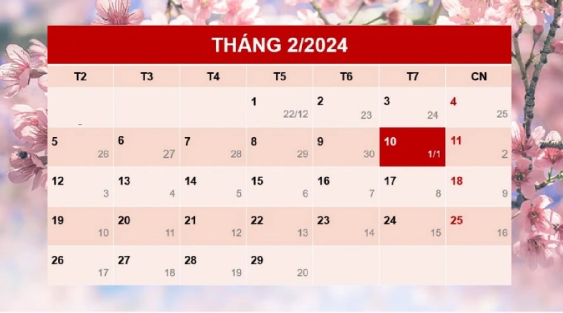 Ngoài ra, Tết Nguyên đán 2024 sẽ rơi vào các ngày như sau: