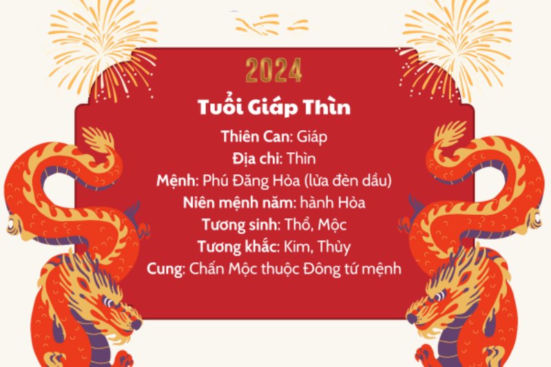 Những người sinh vào năm 2024 Giáp Thìn sẽ mang mệnh Hoả - Hoả hay Phú Đăng Hỏa, ngọn lửa đèn dầu. Các bé sinh năm 2024 thuộc cung Chấn Mộc thuộc Đông Tứ mệnh.
