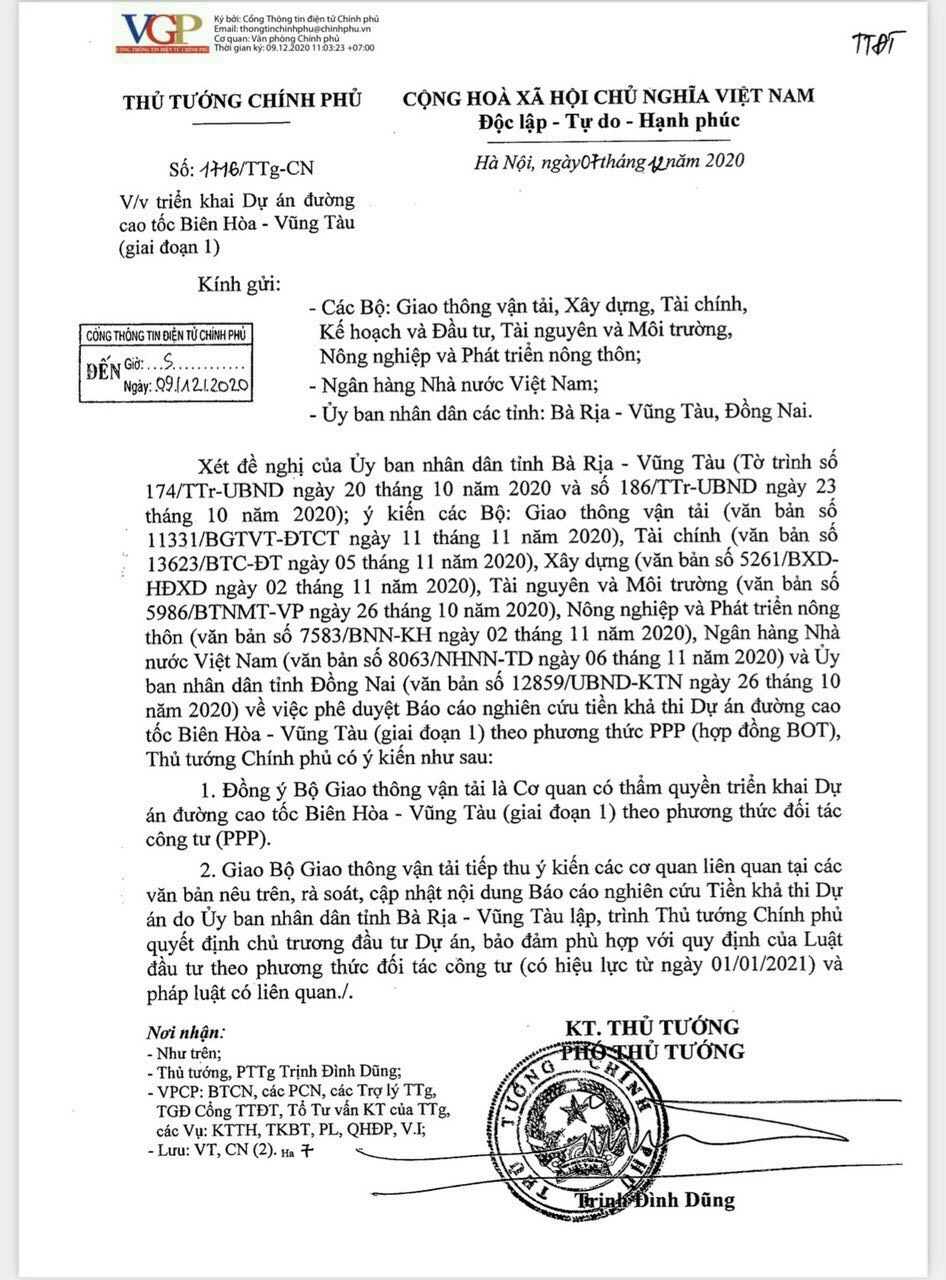 Thủ tướng Chính phủ vừa đồng ý Bộ Giao thông Vận tải (GTVT) là Cơ quan có thẩm quyền triển khai dự án đường cao tốc Biên Hòa-Vũng Tàu, giai đoạn 1, theo phương thức đối tác công tư (PPP). Thời gian có hiệu lực 01/01/2021.