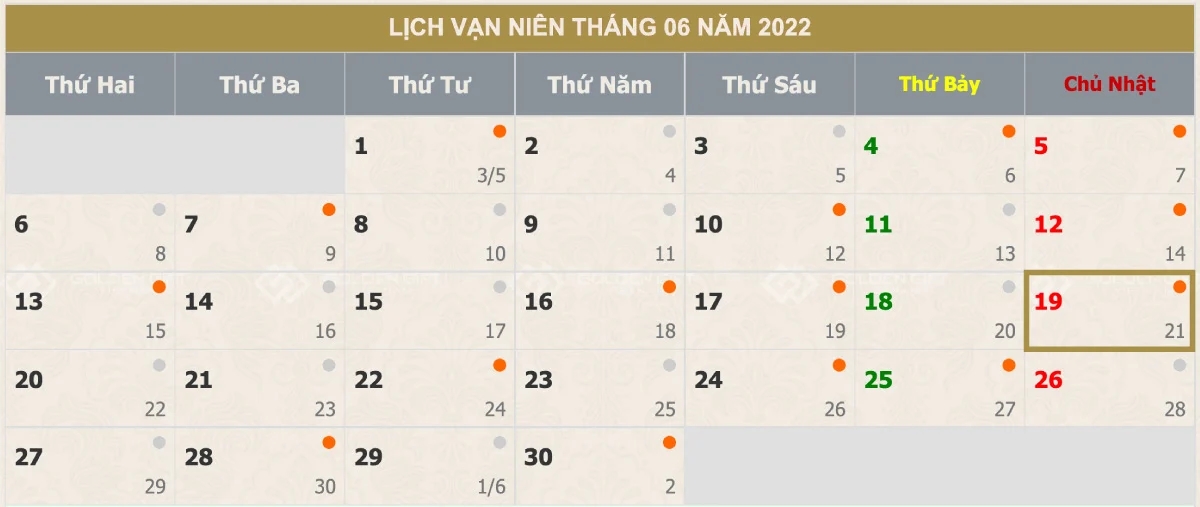 Tương tự như Ngày của Mẹ, hằng năm ngày của Cha không cố định cụ thể, theo quy ước chọn ngày chủ nhật tuần thứ 3 của tháng 6 hàng năm. Trong đó, năm 2022 ngày của cha sẽ rơi vào Chủ nhật ngày 19/6.