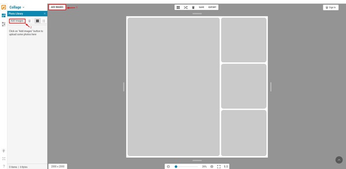 Bước 3: Click vào ô “ADD IMAGES” trên góc trái màn hình và tiếp click chọn “Add images” trong khung “Photo Library” để tải hình ảnh cần sử dụng từ máy tính lên.