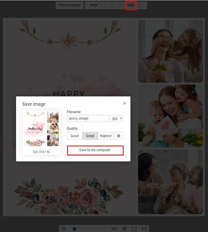 Trong trường hợp hình ảnh không cần chỉnh sửa thêm và muốn lưu hình về máy tính ngay, bạn sẽ click chọn “Save” -> chỉnh sửa “Filename” (tên hình ảnh), Quality (gồm ba tùy chọn chất lượng là Good - Great - Highest, chất lượng càng cao thì hình càng nặng), sau đó nhấn nút “Save to my computer” và chọn nơi lưu hình ghép trên máy tính để hoàn thành.