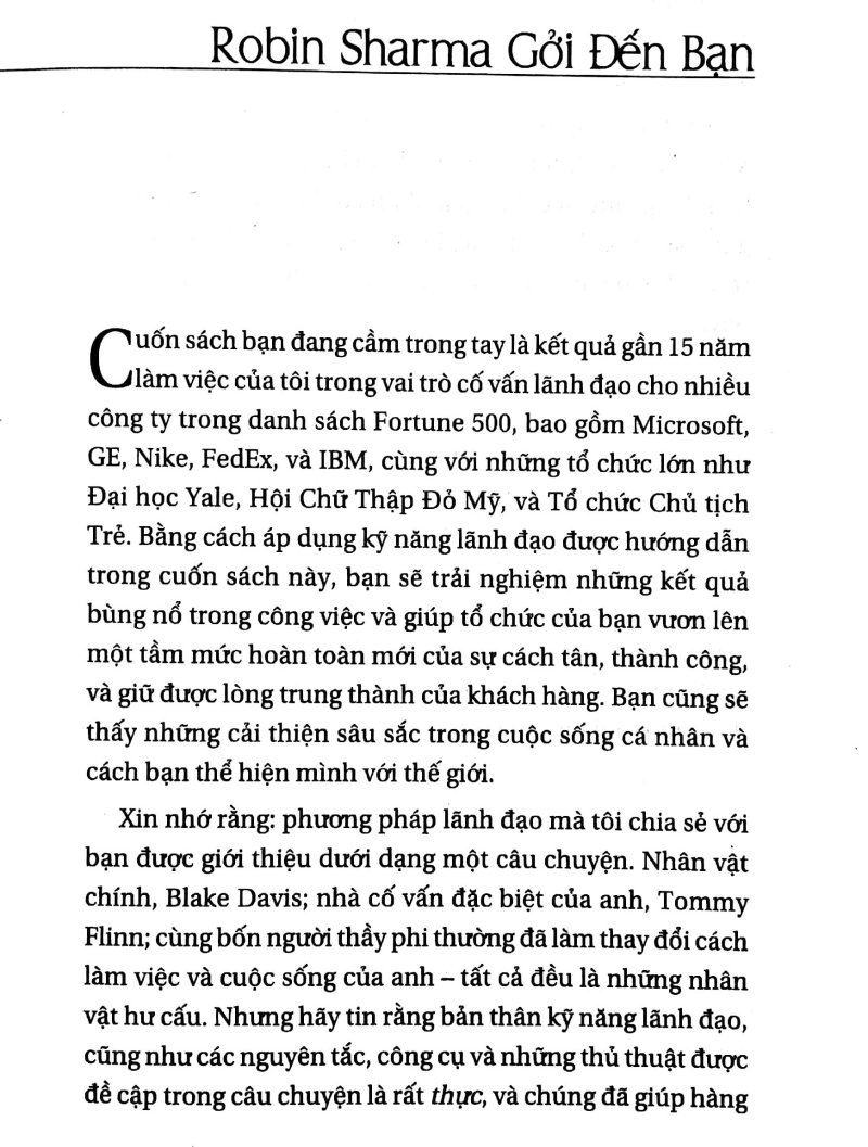 Cuốn sách bạn đang cầm trong tay là kết quả gần 15 năm làm việc của tôi trong vai trò cố vấn lãnh đạo cho nhiều công ty trong danh sách Fortune 500, bao gồm Microsoft, GE, Nike, FedEx, và IBM, cùng với những tổ chức lớn như Đại học Yale, Hội Chữ Thập Đỏ Mỹ, và Tổ chức Chủ tịch Trẻ. Bằng cách áp dụng kỹ năng lãnh đạo được hướng dẫn trong cuốn sách này, bạn sẽ trải nghiệm những kết quả bùng nổ trong công việc và giúp tổ chức của bạn vươn lên một tầm mức hoàn toàn mới của sự cách tân, thành công, và giữ được lòng trung thành của khách hàng. Bạn cũng sẽ thấy những cải thiện sâu sắc trong cuộc sống cá nhân và cách bạn thể hiện mình với thế giới.