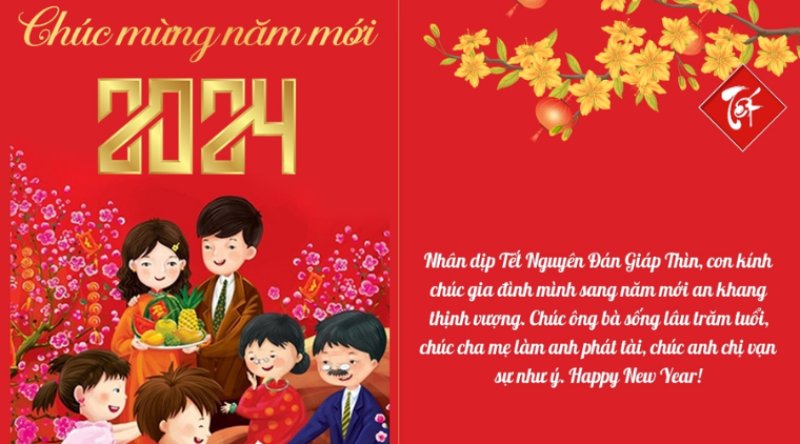 Chúc mừng năm mới, con xin kính chúc hai bác một năm Giáp Thìn tràn đầy sức khỏe, niềm vui và niềm hạnh phúc! Con kính chúc và ước mong rằng mọi ước mơ của hai bác sẽ luôn trở thành sự thật trong năm 2024 này.
