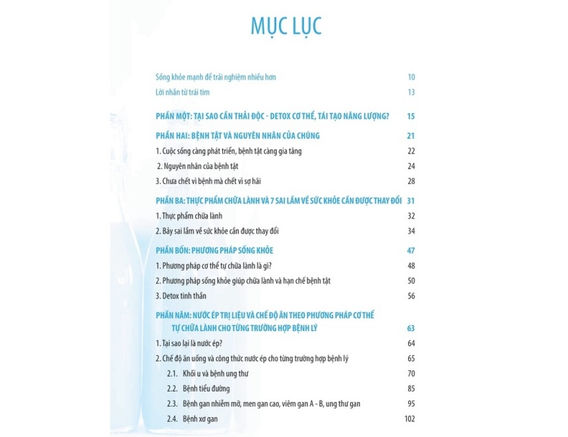 Quyển sách mang đến nhiều thông điệp ý nghĩa, đặc biệt chỉ ra những sai lầm chúng ta hay mắc mỗi khi bị bệnh để từ đó đưa ra cách áp dụng phương pháp cơ thể tự chữa lành, hướng tới chữa bệnh tận gốc thay vì chữa bệnh phần ngọn. Đặc biệt, cuốn sách có những nội dung hướng dẫn cách chế biến các loại nước ép, trà thảo mộc, sinh tố và chế độ ăn thuần tự nhiên hỗ trợ việc điều trị cũng như duy trì sức khỏe viên mãn và đưa ra 11 phương pháp sống khoẻ mà chúng ta cần áp dụng.