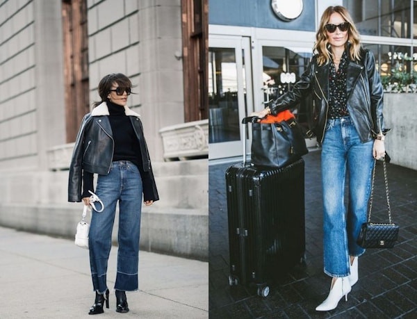 4. Quần jean ống rộng phối cùng áo khoác biker