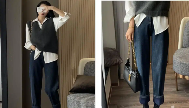 3. Quần jeans ống rộng phối mặc với áo sơ mi và áo len