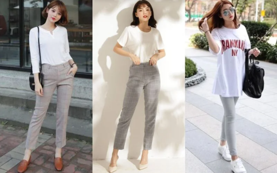 Phối đồ với tông màu trắng luôn là lựa chọn an toàn và không ngoại lệ với việc kết hợp áo trắng cùng quần xám. Outfit sẽ mang lại cảm giác tinh tế, thanh lịch hơn là quá sặc sỡ. Chú ý rằng quần xám nên là tông xám thuần để tránh pha trộn với màu khác như xanh hay đen quá nhiều.