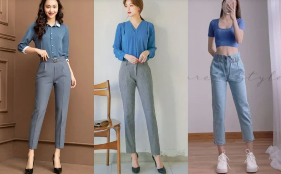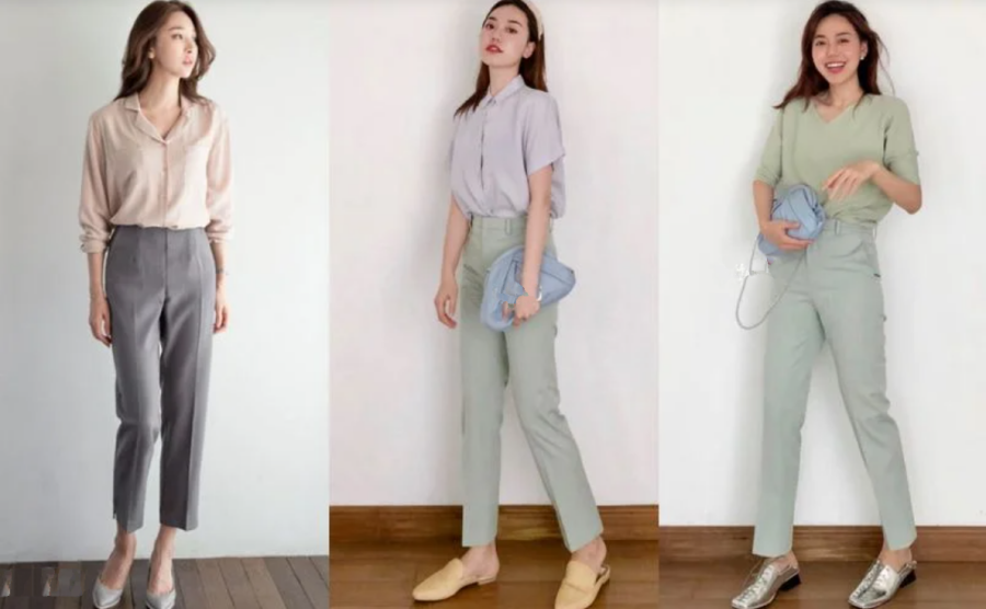 Màu pastel luôn là lựa chọn yêu thích của nhiều chị em phụ nữ. Hãy thử phối chiếc áo pastel với quần màu xám nhé.