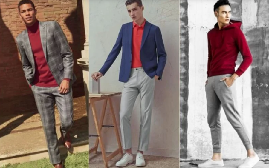 Hãy thử phối quần kaki xám với chiếc áo đỏ để tạo sự phá cách và cuốn hút. Màu sắc tươi sáng của áo sẽ làm giảm sự nhàm chán của màu xám. Trong khi đó quần lại giúp làm dịu sự nổi bật của màu đỏ - một màu sắc thường khiến người mặc cảm thấy khó chịu.