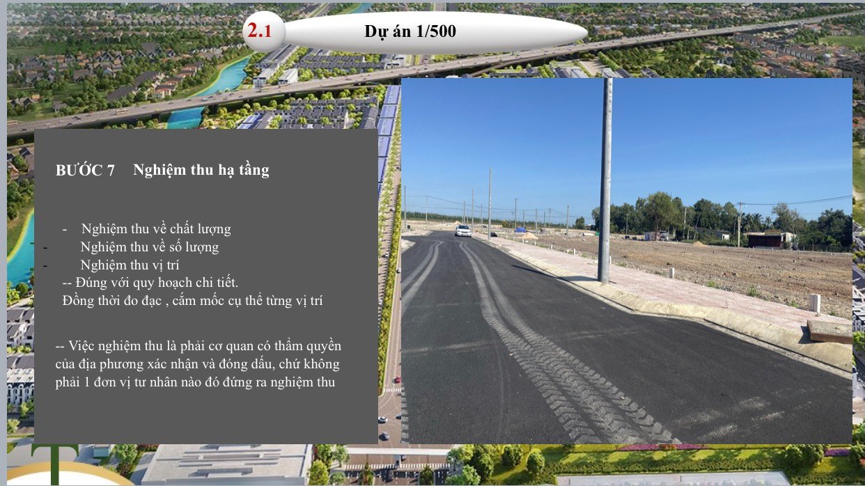 Nghiệm thụ về chất lượng, nghiệp thu về số lượng, nghiệm thu về vị trí -> Phải đúng như quy hoạch 1/500 chi tiết, đồng thời đo đặc, cắm cốc mốc cục thể theo từng vị trí.