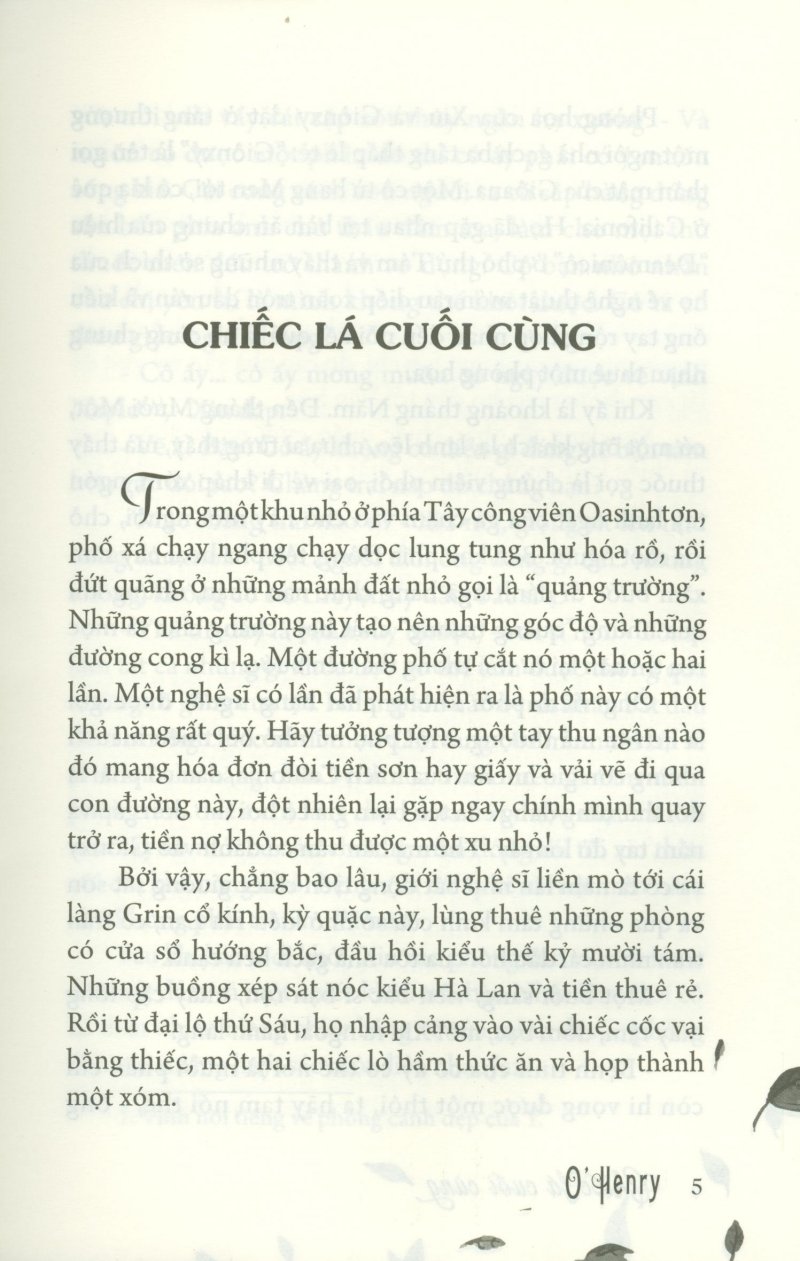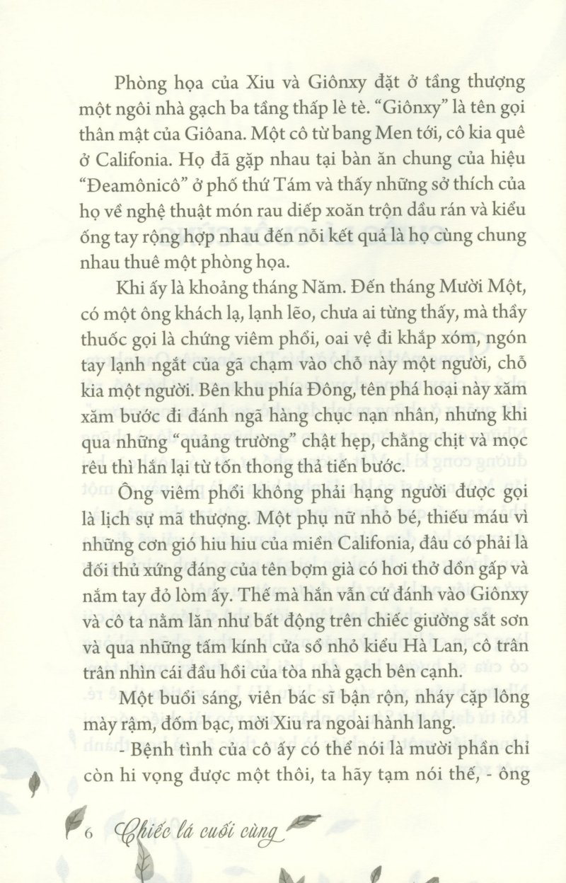 Chiếc Lá Cuối Cùng là tác phẩm văn học được chắp bút từ tác giả O’ Henry. Cuốn sách khá quen thuộc với nhiều thế hệ học sinh Việt Nam cũng như các độc giả. Tác giả đã vẽ nên những nhân vật với một câu chuyện vô cùng sâu sắc, lắng đọng chạm đến trái tim người đọc.