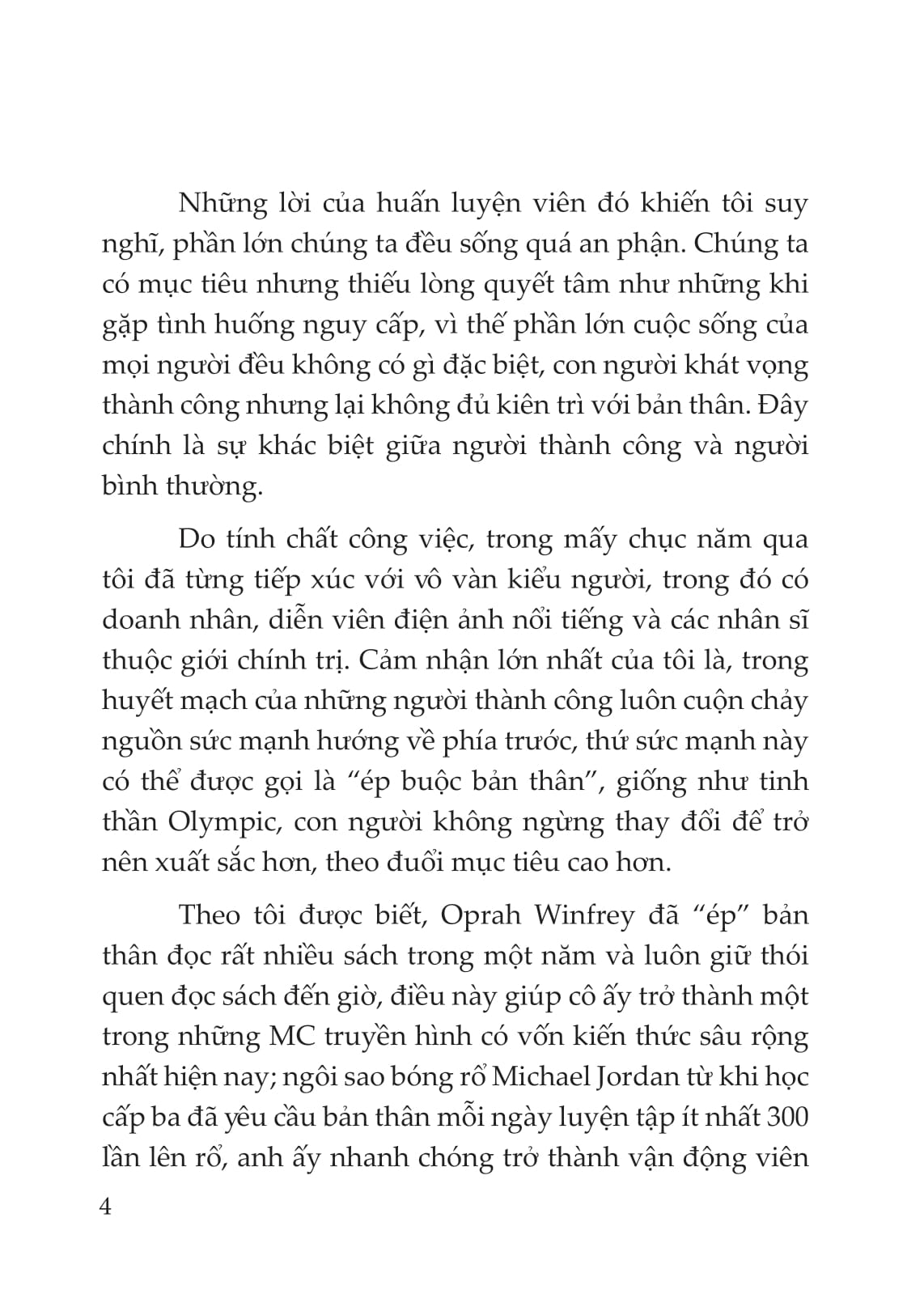 Điều đầu tiên tác giả chia sẻ chính là thói quen chỉnh đồng hồ nhanh 5 phút. Tại sao phải làm như vậy? Ý nghĩa của việc này chính là: Sắp không kịp rồi, nhanh lên. Nếu con người trong trạng thái vội vã thì nhất định sẽ làm việc hết công suất. Chỉnh đồng hồ nhanh 5 phút cũng là cách khiến cho bản thân vì theo đuổi thành công mà phải nhanh chân hơn. Tuổi trẻ của chúng ta không thừa để lãng phí thời gian.