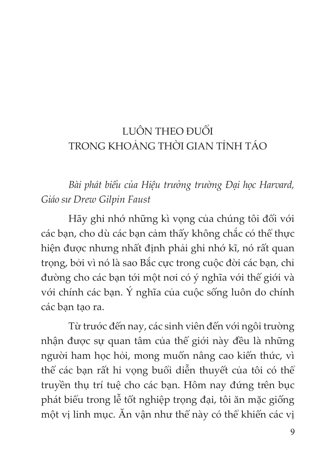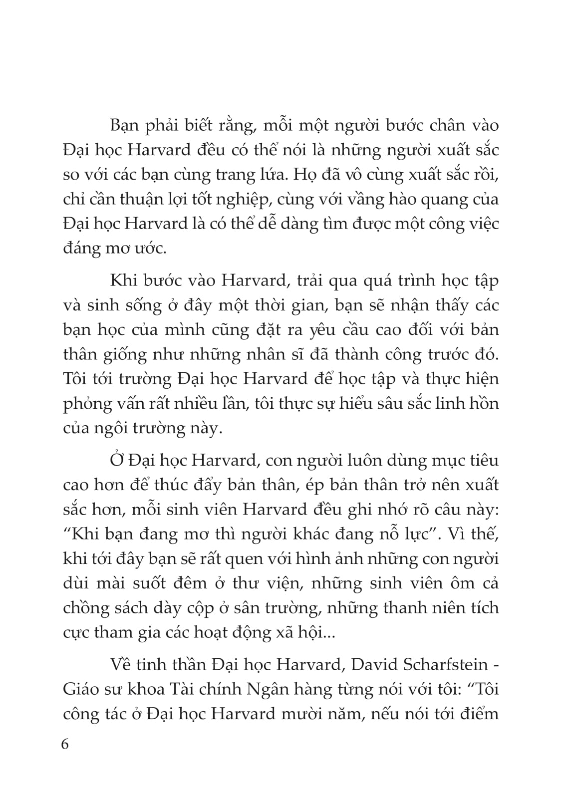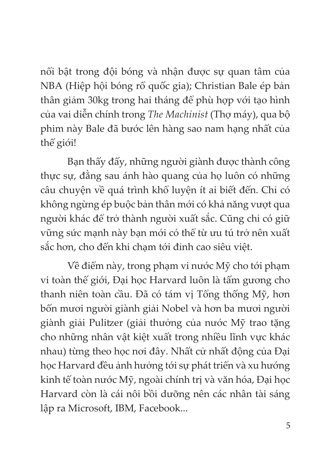 Trong chương cuối của cuốn sách, tác giả đề cập đến vấn đề: Phấn đấu và trở thành số 1 Harvard. Để làm được điều đó, điều quan trọng hơn cả bạn cần phải có chính là không ngừng rèn luyện. Tác giả khuyên rằng hãy tránh xa những thứ ảnh hưởng đến khả năng tự chủ của bạn, quản lí thời gian cho hiệu quả, tích cực điều chỉnh tâm trạng của mình… Đây hoàn toàn là những bài học mà bạn cần học tập và rèn luyện tốt ngay từ bây giờ.
