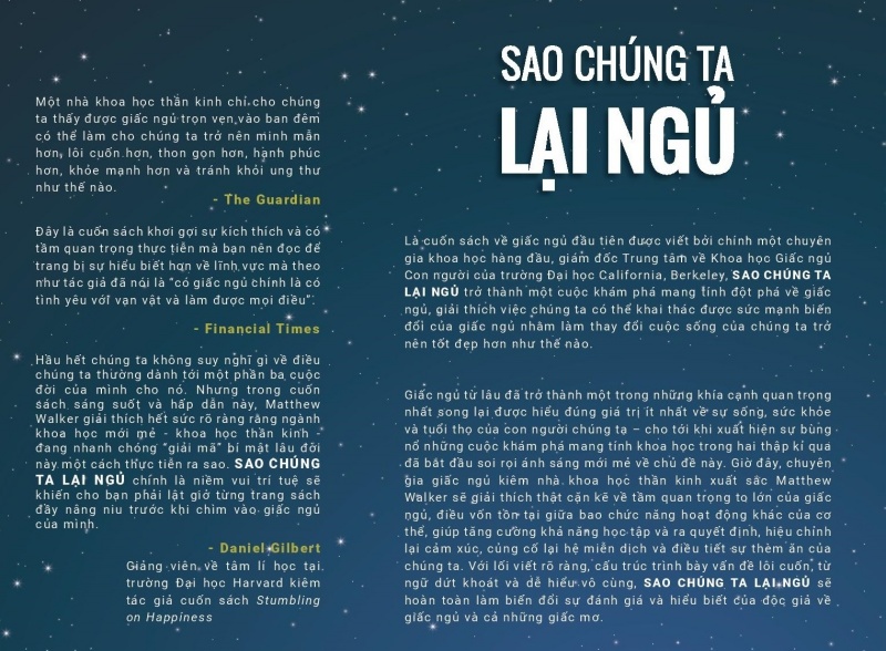 Là cuốn sách về giấc ngủ đầu tiên được viết bởi chính một chuyên gia khoa học hàng đầu, giám đốc Trung tâm về Khoa học Giấc ngủ Con người của trường Đại học California, Berkeley, Sao chúng ta lại ngủ trở thành một cuộc khám phá mang tính đột phá về giấc ngủ, giải thích việc chúng ta có thể khai thác được sức mạnh biến đổi của giấc ngủ nhằm làm thay đổi cuộc sống của chúng ta trở nên tốt đẹp hơn như thế nào.