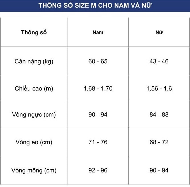 Bảng size M của nam và nữ được thể hiện chi tiết như sau: