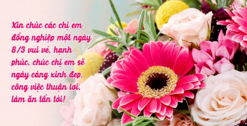Ngày 8/3, chúc chị tay ôm nhiều hoa, được thật đầy quà, được đi chơi xa, ăn uống thả ga, tiền không phải trả, nói năng rôm rả, cười tươi như hoa.