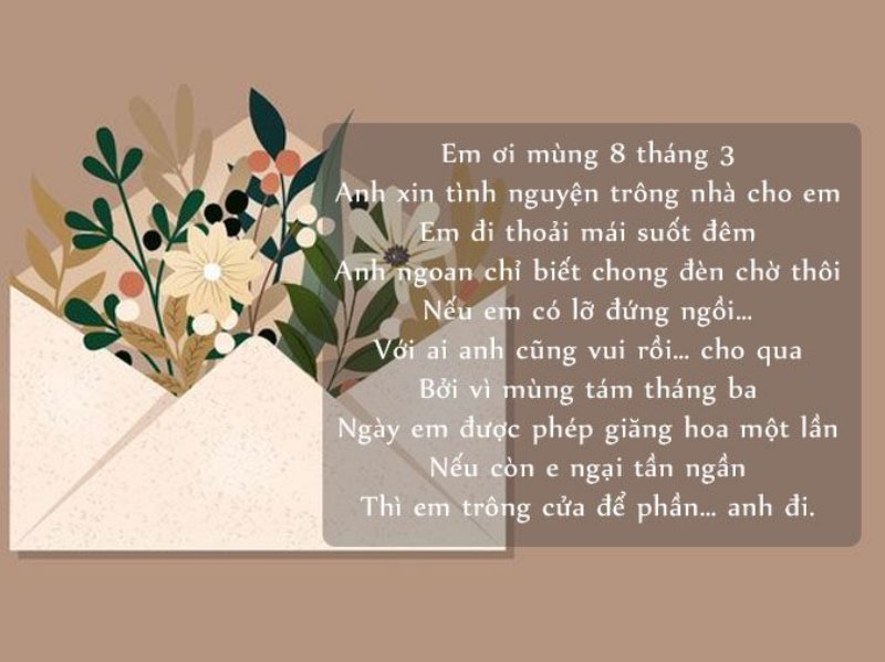 Nhân ngày 8/3, chúc một nửa xinh đẹp của thế giới luôn tươi trẻ, hạnh phúc, mọi việc đều thuận lợi. Chúc chị em ta, tay ôm nhiều hoa, giỏ đựng đầy quà, khỏi lo việc nhà, ăn uống thả ga, tiền không phải trả, nói năng rôm rả, cười tươi như hoa.