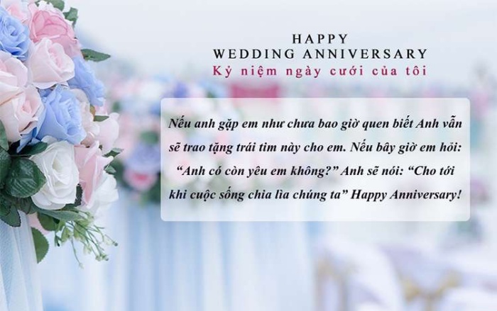 Nếu anh gặp em như chưa bao giờ quen biết, anh vẫn sẽ không thay đổi quyết định mà trao tặng trái tim này cho em. Nếu bây giờ em hỏi: “Anh có còn yêu em nhiều không?” Anh sẽ nói: “Anh đã, đang và sẽ yêu em cho tới khi cuộc sống chia lìa chúng ta” Happy Anniversary! Yêu em thật nhiều!