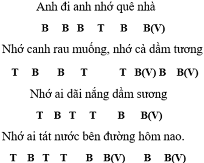 - Thanh điệu: Sẽ có sự đối xứng luân phiên giữa các âm B – T- B ở các tiếng thứ 2, 4, 6 trong mỗi dòng thơ lục bát. Và đồng thời, nó sẽ đối lập với âm vực trầm bổng ở tiếng thứ 6 và thứ 8 trong dòng bát. Song song đó, từ chữ thứ 2 và thứ 6 trong câu bát sẽ là vần bằng. Nhưng nếu chữ thứ 6 là thành không có dấu thì chữ thứ 8 phải thuộc thanh trầm bình.