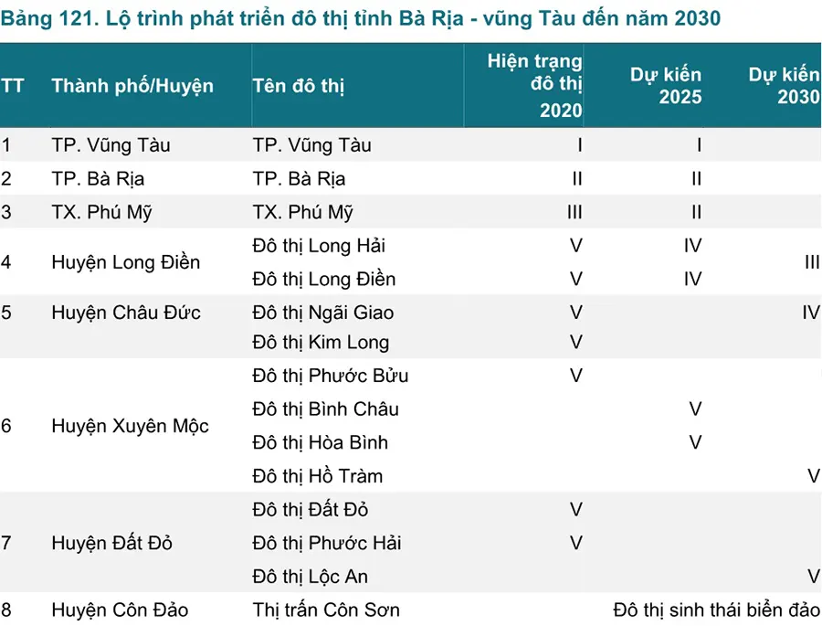 - 09 đô thị loại V gồm: Đô thị Kim Long – huyện Châu Đức; Đô thị Phước Bửu, Hòa Bình, Bình Châu, Hồ Tràm – huyện Xuyên Mộc; Đô thị Đất Đỏ, Phước Hải, Lộc An – huyện Đất Đỏ; 01 đô thị sinh thái biển đảo – Côn Đảo.