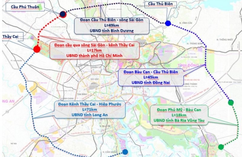 Vào tháng 9/2021, Thủ tướng đã phê duyệt cho 5 tỉnh và thành phố là cơ quan có thẩm quyền đầu tư cho các đoạn tuyến thuộc Vành đai 4 trên địa bàn. Cụ thể, Bà Rịa-Vũng Tàu sẽ thực hiện đoạn từ Phú Mỹ đến Bàu Cạn, dài khoảng 18km; Đồng Nai thực hiện đoạn từ Bàu Cạn đến cầu Thủ Biên, dài khoảng 45km; Bình Dương thực hiện đoạn từ cầu Thủ Biên đến sông Sài Gòn (bao gồm cầu Thủ Biên), dài khoảng 49km; Long An thực hiện đoạn từ kênh Thầy Cai đến Hiệp Phước, dài khoảng 71km; còn TP.Hồ Chí Minh sẽ thực hiện đoạn từ cầu qua sông Sài Gòn đến kênh Thầy Cai (bao gồm cầu vượt sông Sài Gòn), dài khoảng 17km.