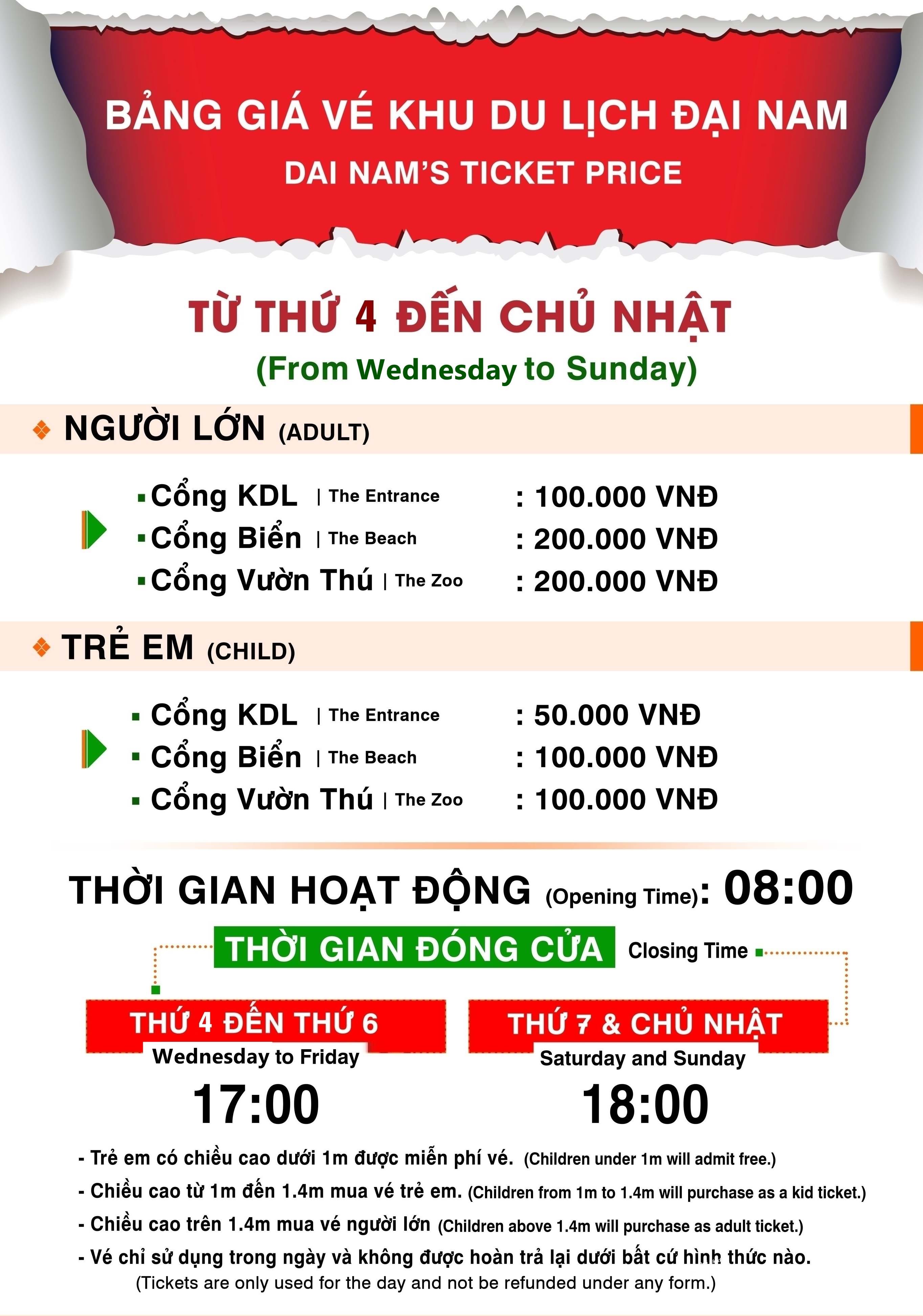 - Giá vé vào cổng: 100.000 đồng/người lớn, trẻ em cao dưới 1m được miễn phí (vé trẻ em bằng nửa giá vé người lớn)