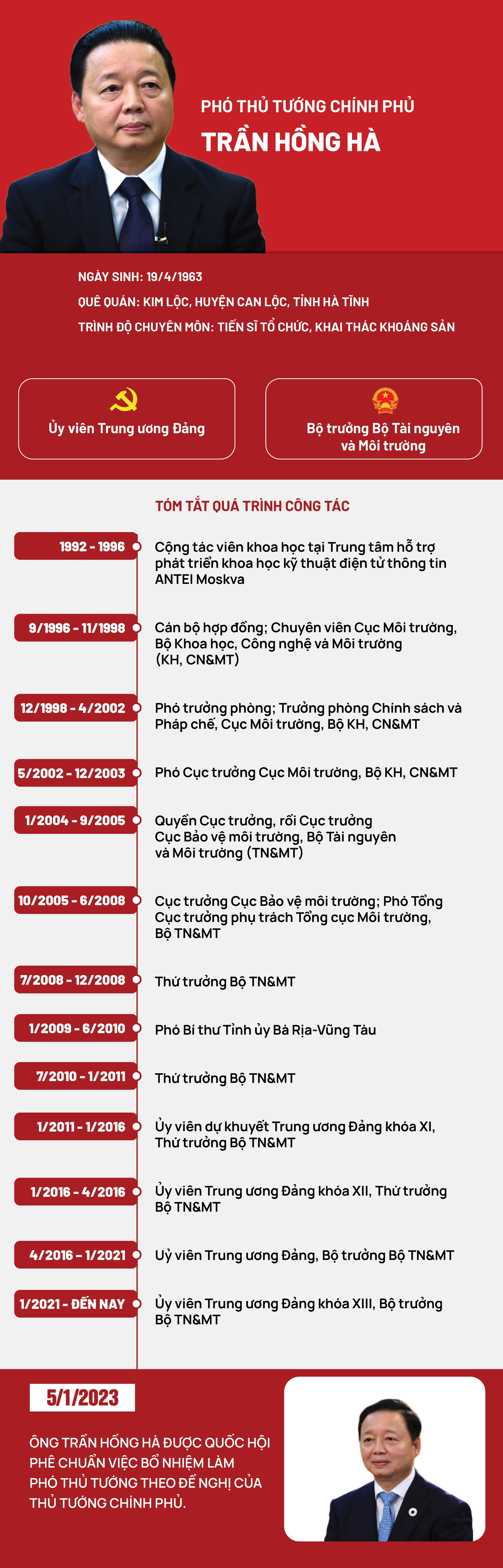 Ngày 05/01/2023: Tại kỳ họp bất thường lần thứ 2 - Quốc hội khóa XV, đồng chí Trần Hồng Hà được Quốc hội phê chuẩn bổ nhiệm chức vụ Phó Thủ tướng Chính phủ.