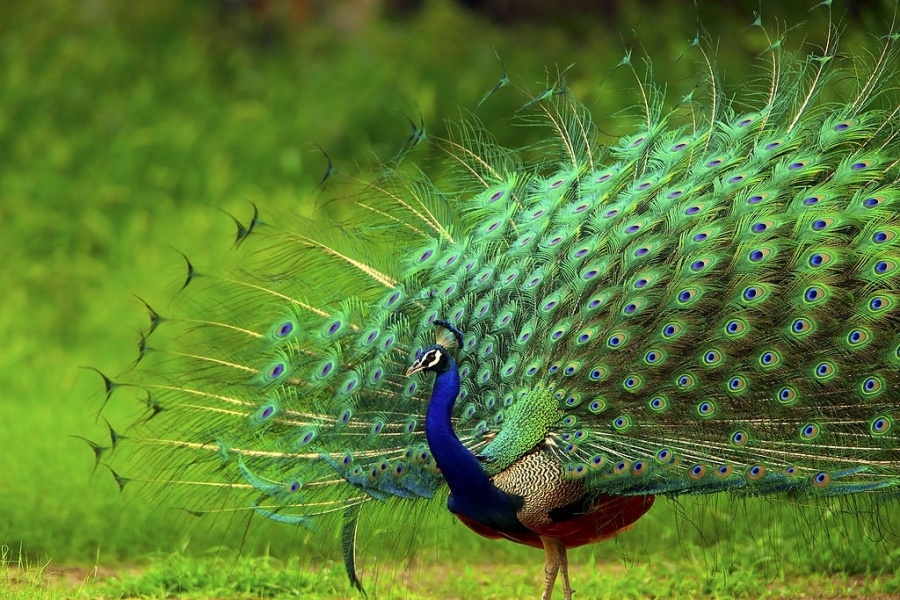 Cái đuôi của chú công khi xòe ra sẽ có màu xanh lục bảo trông giống một chiếc quạt có đính đá quý vậy. Những tiếng xuýt xoa và trầm trồ từ người xem khiến chú ta lại càng thêm kiêu hãnh, đi đi lại lại như một diễn viên đang trình diễn dưới ánh đèn sân khấu. Dưới ánh nắng mặt trời, từng sợi lông trên chiếc đuôi của chú như lấp lánh dưới ánh nắng mặt trời.